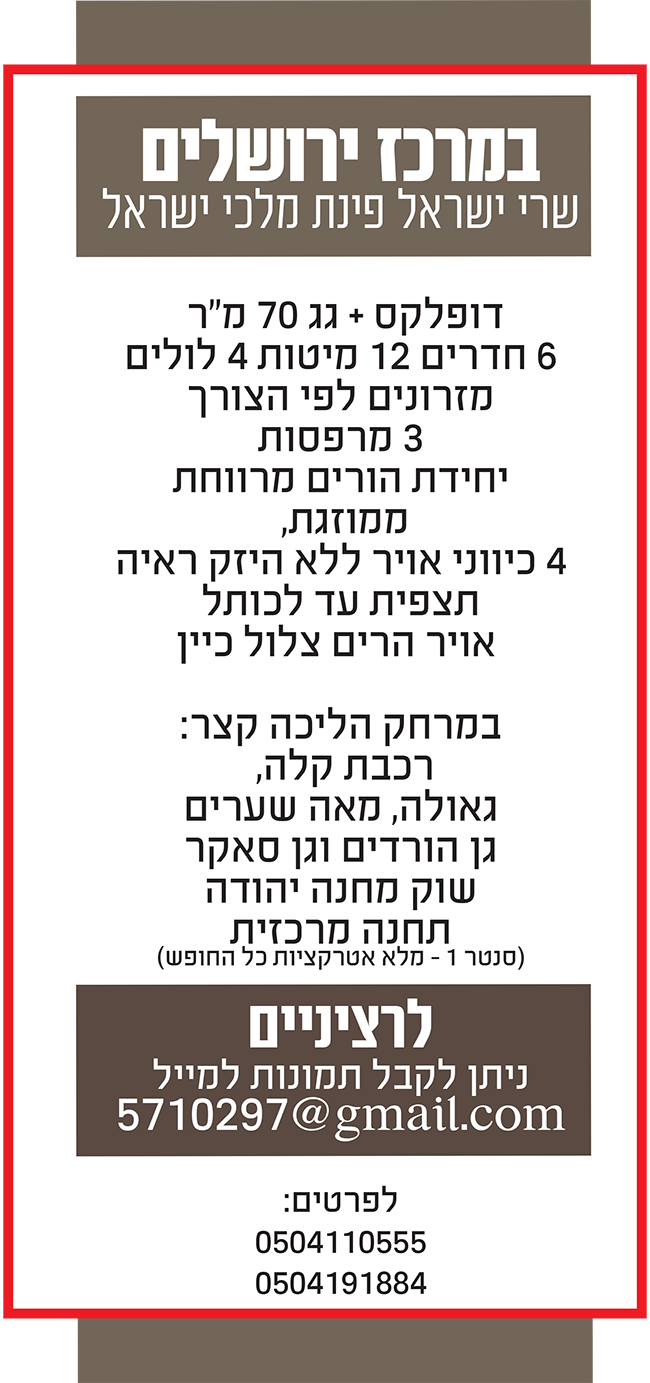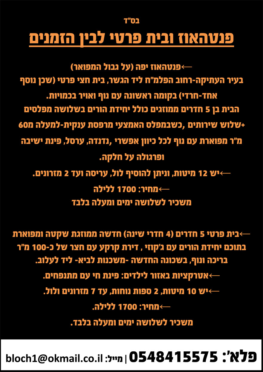 להשכרה בבין הזמנים, לשבועיים, מיום רביעי י"ג אב עד יום שלישי כ"ו אב