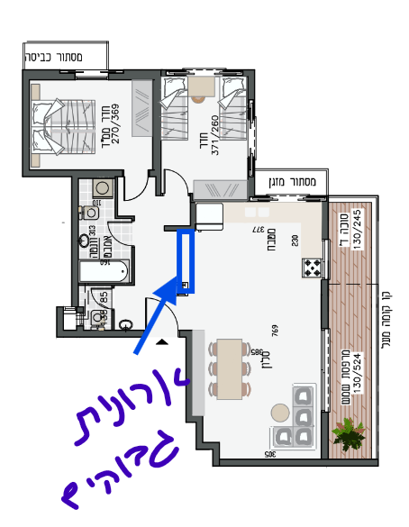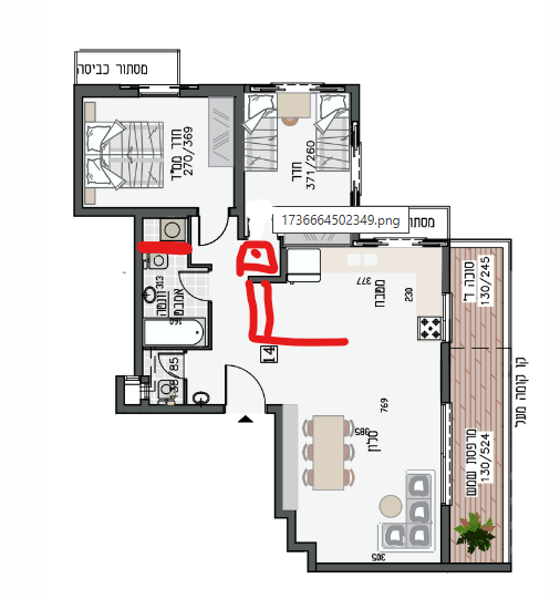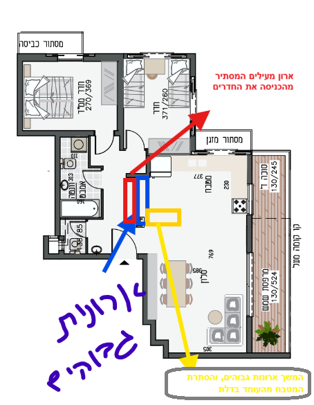 ואז צריך להעביר לשם גם צנרת וגם אינסטלציה, צריך לבדוק שאפשריצד אחד ארונות גבוהים במטבח ובצד של המסדרון מתלה מעילים