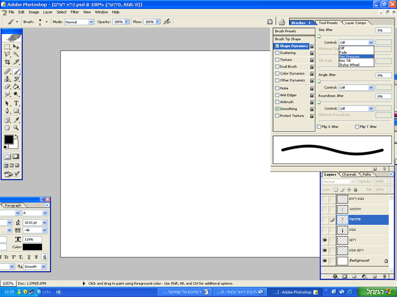 משם תעקבי אחרי התמונה , המטרה ש"shape dynamics" יהיה מסומן ובתוכו "pen pressure"