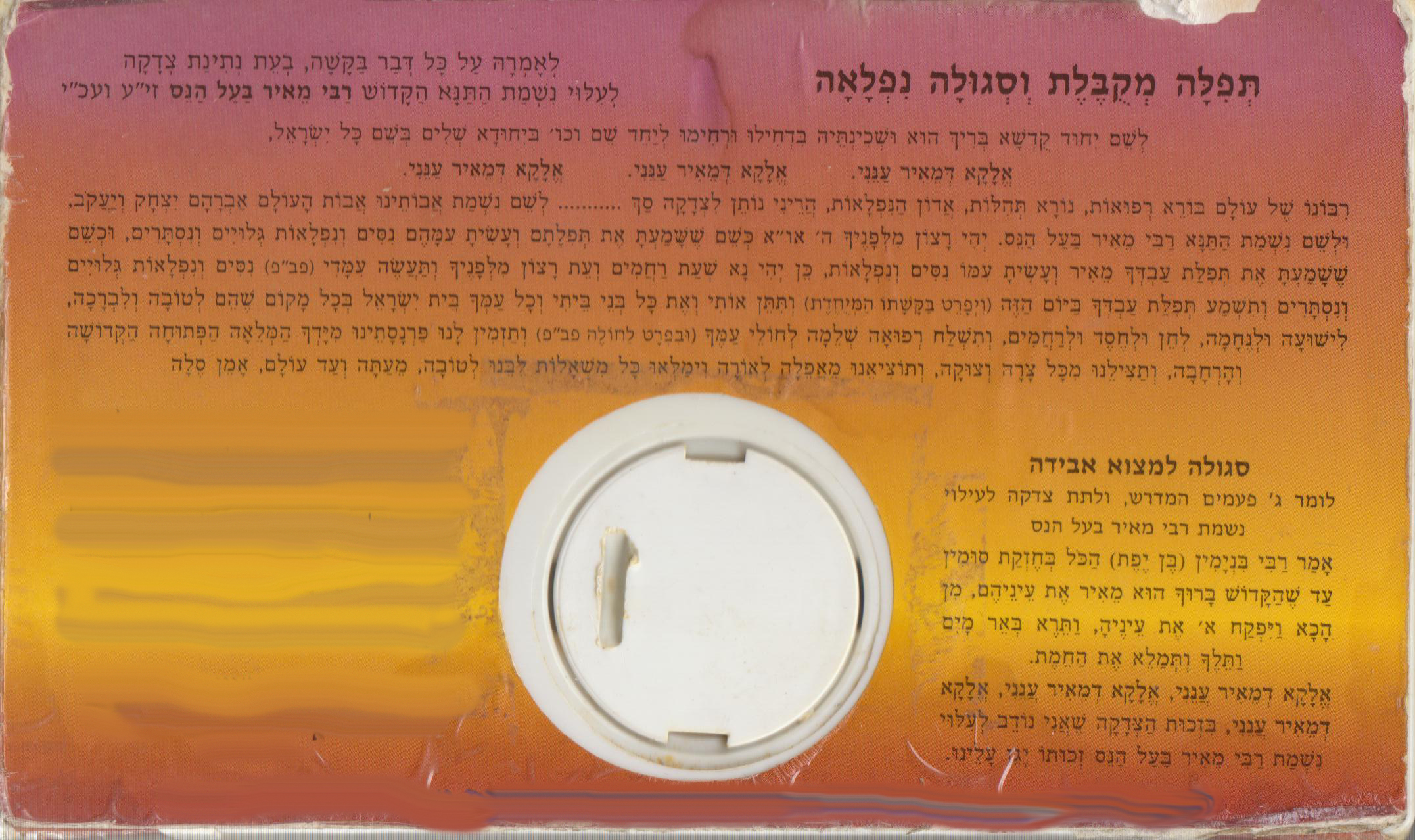 הריני נותן לצדקה עבור ישיבת רבי מאיר בעל הנס - אור תורה, סך____ לשם נשמת אבותינו אבות העולם אברהם יצחק ויעקב, ולשם נשמת התנא רבי מאיר בעל הנס, יהי רצון מלפניך ה' אלוקינו ואלוקי אבותינו כשם ששמעת את תפלתם ועשית עמהם נסים ונפלאות גלויים ונסתרים, וכשם ששמעת את תפלת עבדך מאיר ועשית עמו נסים ונפלאות כן תהא נא שעת רחמים ועת רצון מלפניך לעשות עמדי (פב"פ) נסים ונפלאות גלויים ונסתרים, ותשמע תפלת עבדך ביום הזה (כאן יפרט בקשתו המיוחדת) ותתן אותי ואת כל בני ביתי וכל עמך בית ישראל בכל מקום שהם לטובה ולברכה לישועה ולנחמה, לחן ולחסד ולרחמים, ותשלח רפואה שלימה לחולי עמך (ובפרט לחולה פב"פ) ותזמין לנו פרנסתינו מידך המלאה הפתוחה הקדושה והרחבה, ותצילנו מכל צרה וצוקה, ותוציאנו מאפילה לאורה, וימלאו כל משאלות לבנו לטובה, מעתה ועד עולם אמן סלה.