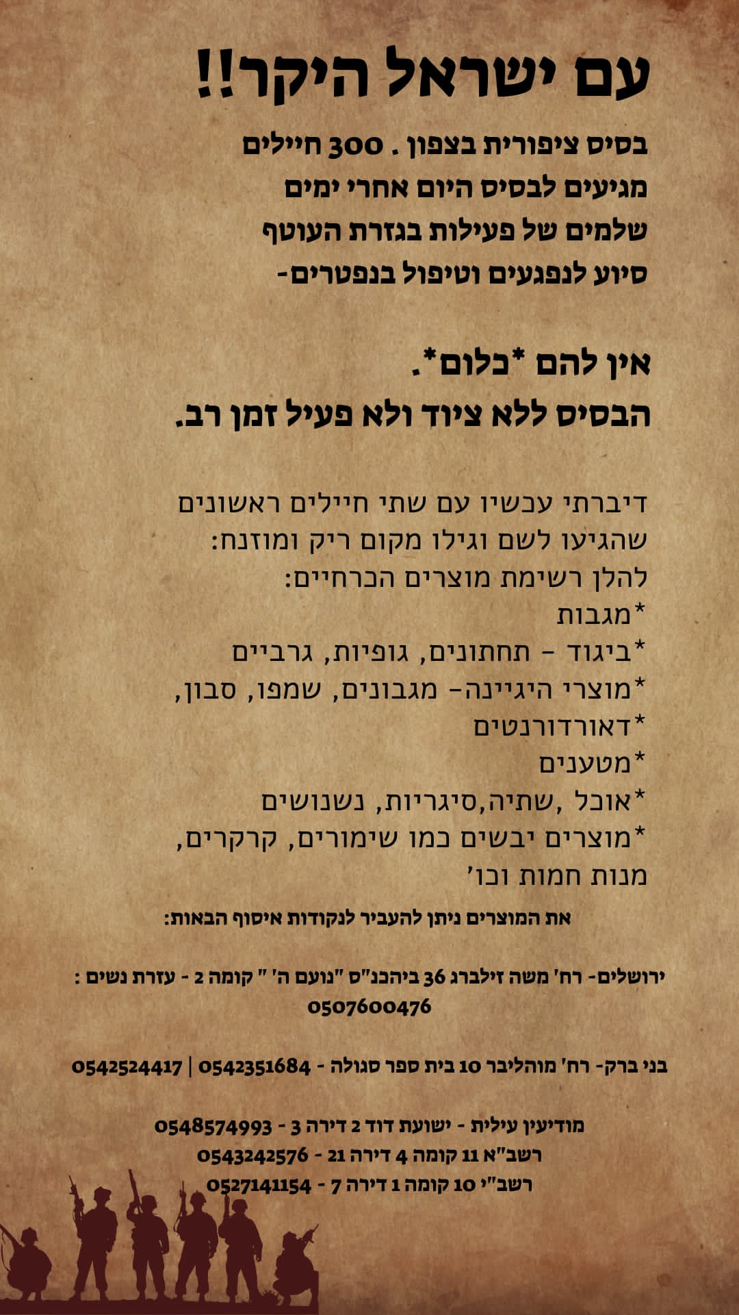 בקשה דרוש מזון ומוצרים בסיסיים לחיילים