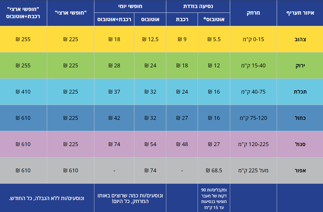 הטבלה ממש פשוטה- במיוחד שממש לא היה לי (ולרבים כמותי) ברור אם החופשי חודשי כולל רכבת או לא וכמה עולה כל מרחק.