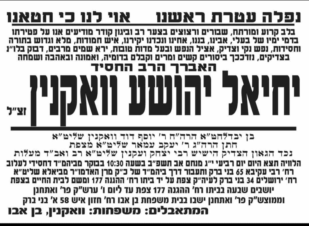 מסע הלוויה מחר בשעה 11:00 בבוקר מבית המדרש ביאלא בני ברק ברחוב ירושלים 34 בעיר ולאחר מכן בצפת בשעות הצהריים, שעה מדוייקת נעדכן בהמשך.