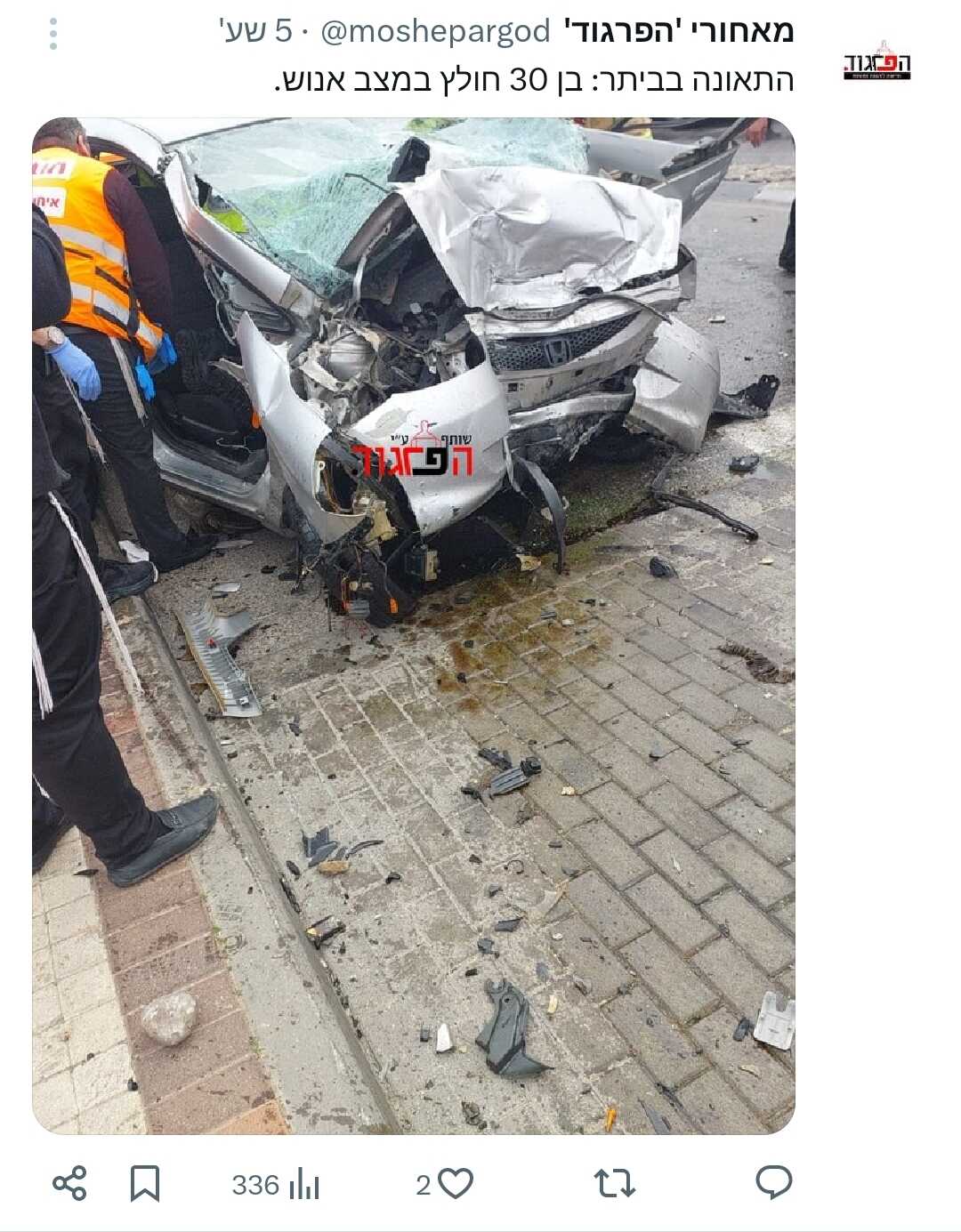 ‏הציבור מתבקש להתפלל עבור ר׳ אביתר בן בושמת (35) שנפצע הבוקר באורח אנוש בתאונה בביתר עילית. בנו שהיה עימו ברכב נפצע באורח קל (מנחם קולדצקי)