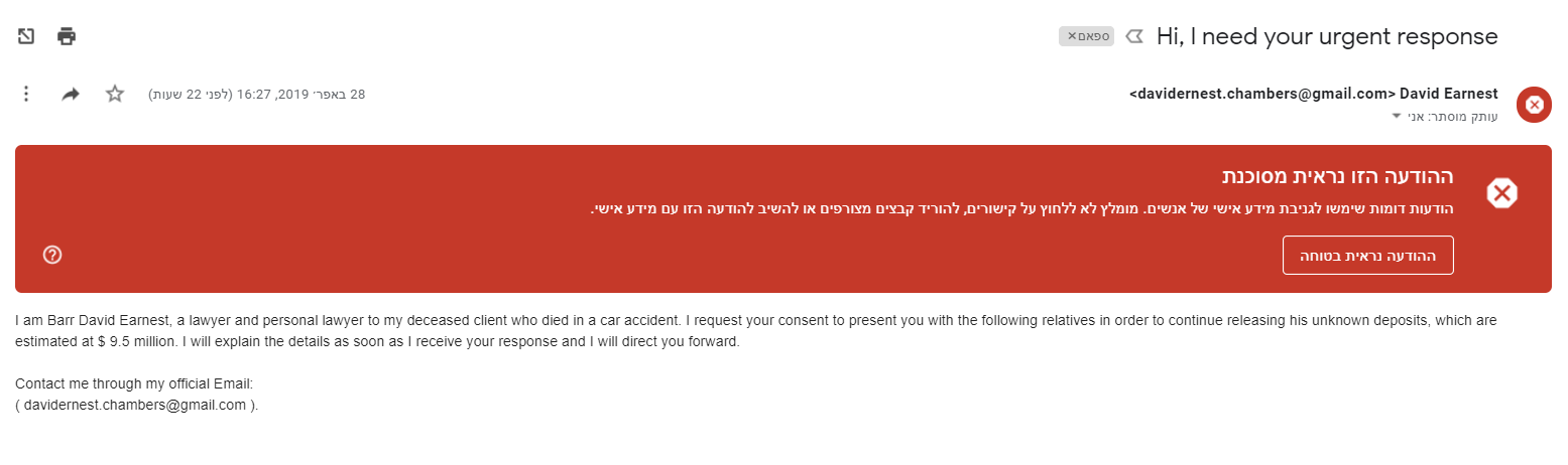 זה מייל שקיבלתי, אבל הג'ימייל מזהה אותו כמסוכן.