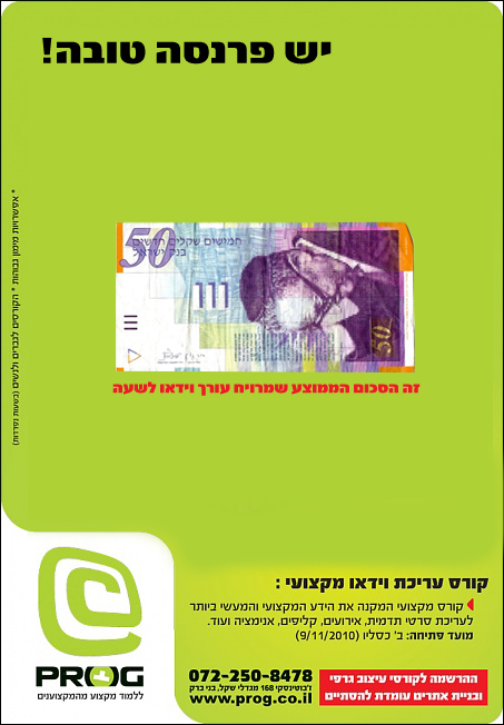 כשחשבתי על רעיון לפרסום, עלה לי בראש כל מיני רעיונות שקשורים לסרטים, חתונות, לקליפים, אבל זה פספוס מכיוון שהפרסום והדגש צריך להיות על נושא לימוד עריכה, פרסומת שתמשוך אנשים ללמוד עריכה. ואז הגיעה המסקנה שתכל'ס מה שצריך למשוך אנשים ללמוד עריכה זה הפרנסה הטובה שיש בזה.