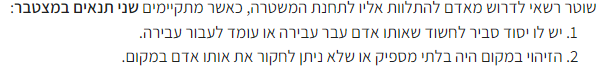 • על פי החוק שוטר רשאי לדרוש מאדם להילוות עמו לתחנת המשטרה או לזמנו לתחנת המשטרה למועד אחר שיקבע, כאשר נתקיימו שני התנאים הבאים: