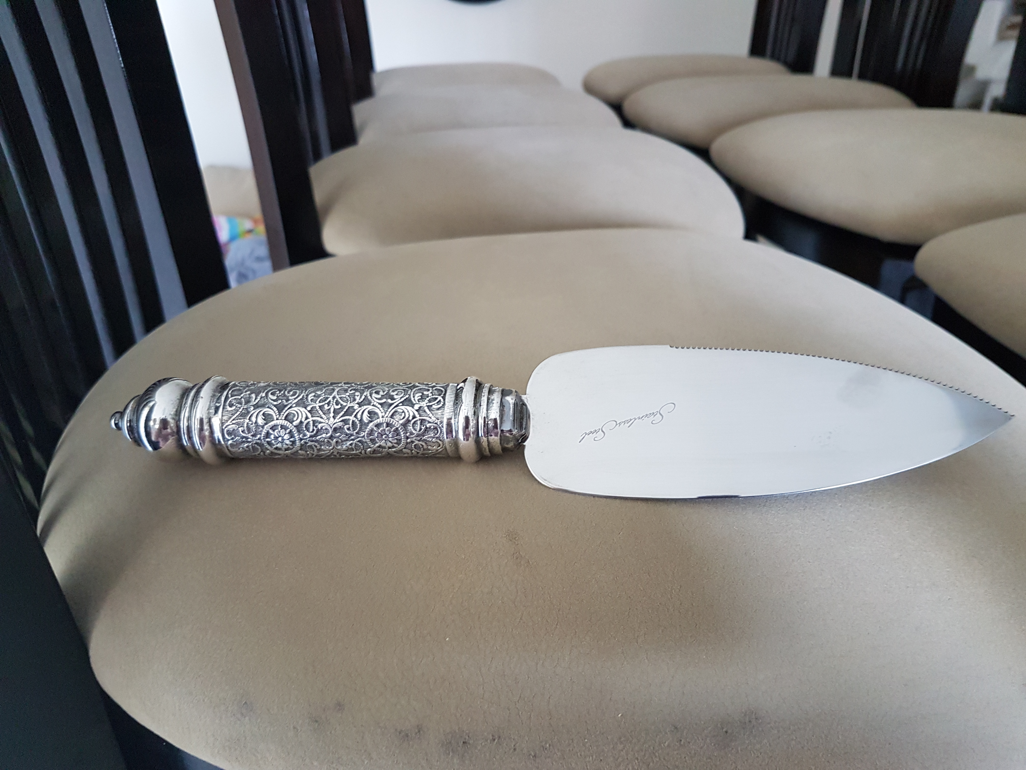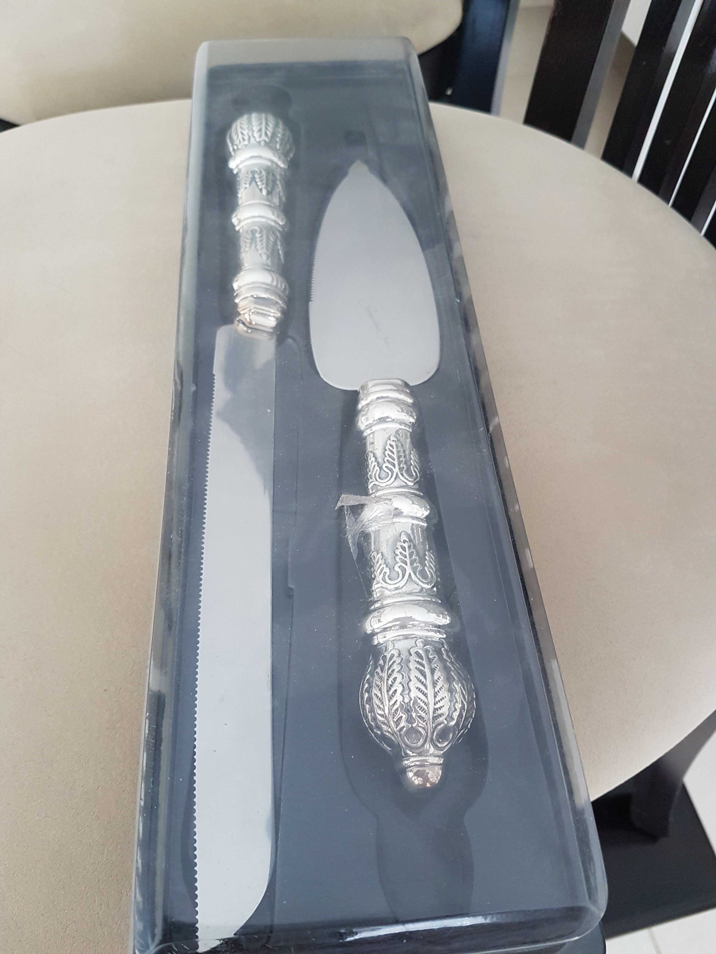 למכירה בבני ברק סכין לחלות+ סכין לעוגה מכסף וכן סכין נוספת לעוגה מכסף.