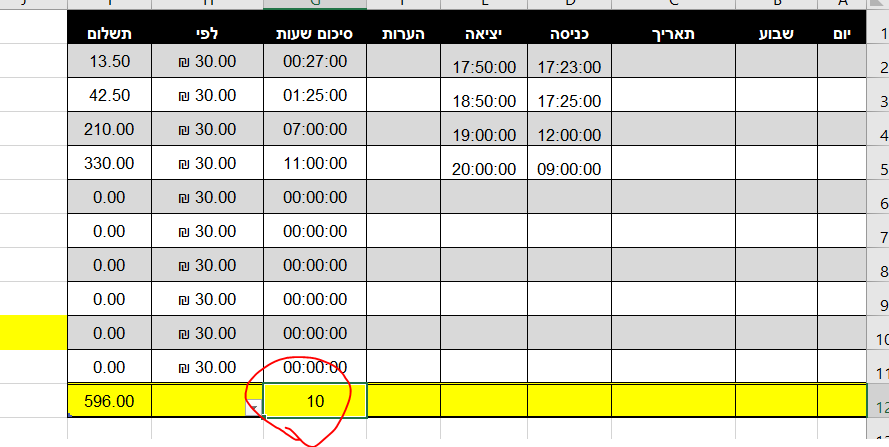 דבר שני, יש לי קובץ אקסל של חישוב שעות עבודה (מילוי תאריך, כניסה, יציאה, סכום לתשלום וסה"כ)