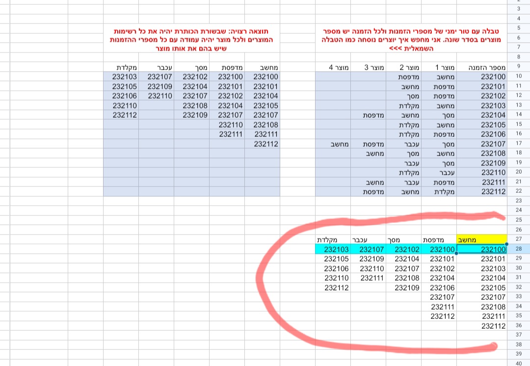 יש לי טבלה עם עמודה ימין שבה יש מספרי הזמנות לכל מספר הזמנה יש שורה עם מספר מוצרים אני רוצה לדעת איך אפשר לעשות טבלה נוספת שבה סוגי המוצרים יהיו בשורת כותרת ואז מתחת לכל מוצר יהיה עמודה עם כל מספרי ההזמנות שבהם יש את המוצר הזה. מצורפת דוגמה