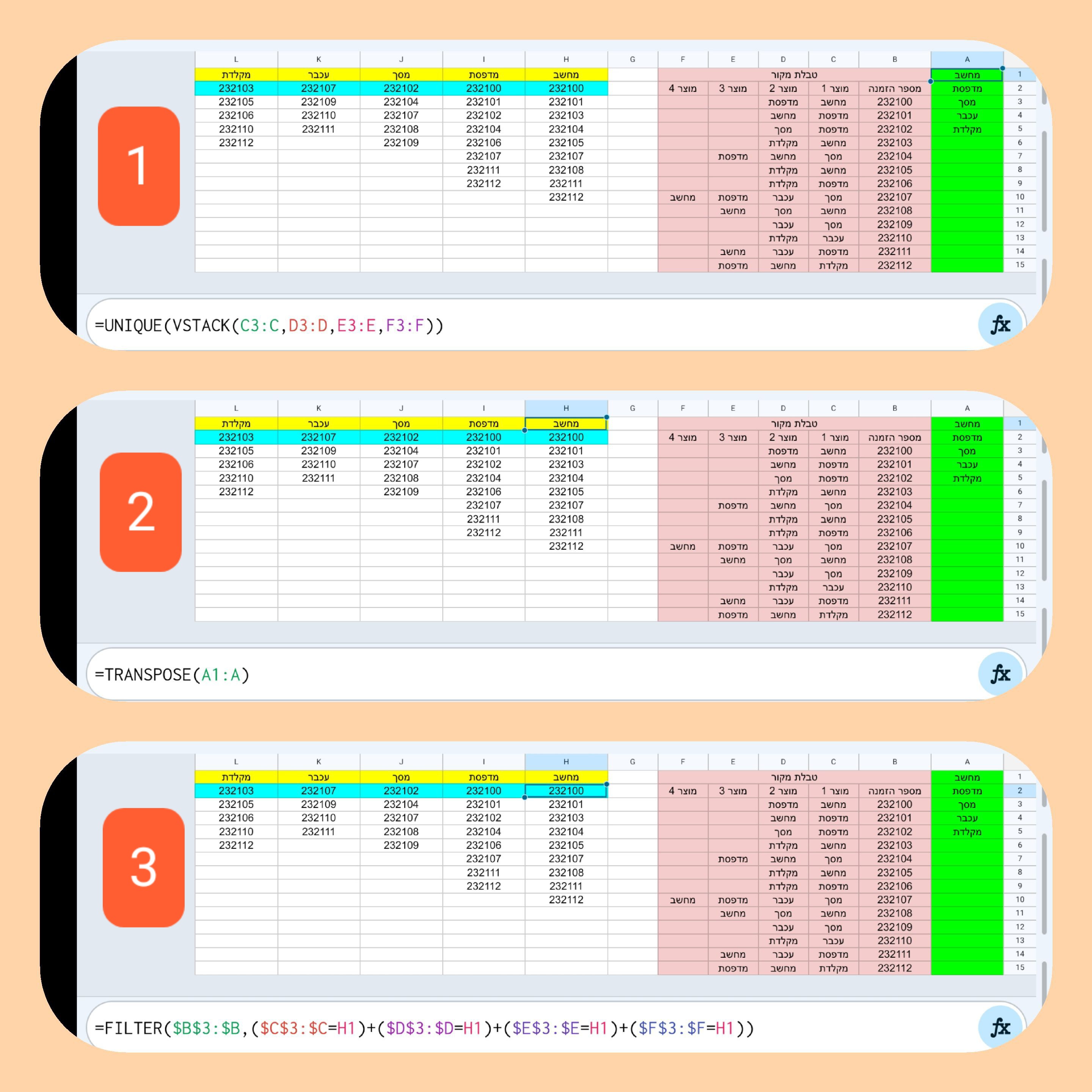 בעמודה A הצבועה בירוק (הוספתי אותה כעמודה ריקה) יש להזין בתא a1 את פונקציית vstack שמקבצת את כל ערכי עמודות המוצרים ומחזירה אותם בטור אנכי ובעמודה אחת.