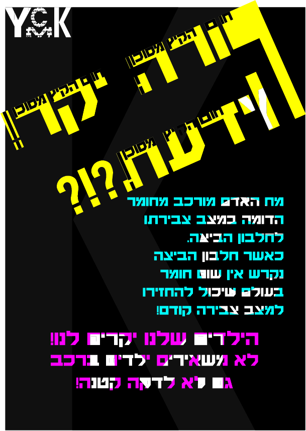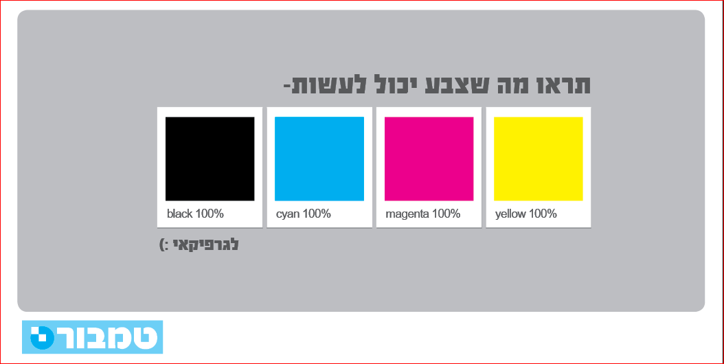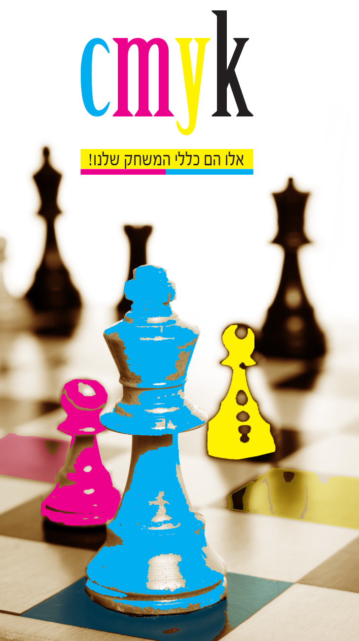 על הכרזה להיות מורכבת מ-4 צבעי היסוד CMYK ללא תערובת גוונים. (ניתן לשחק בשקיפויות)