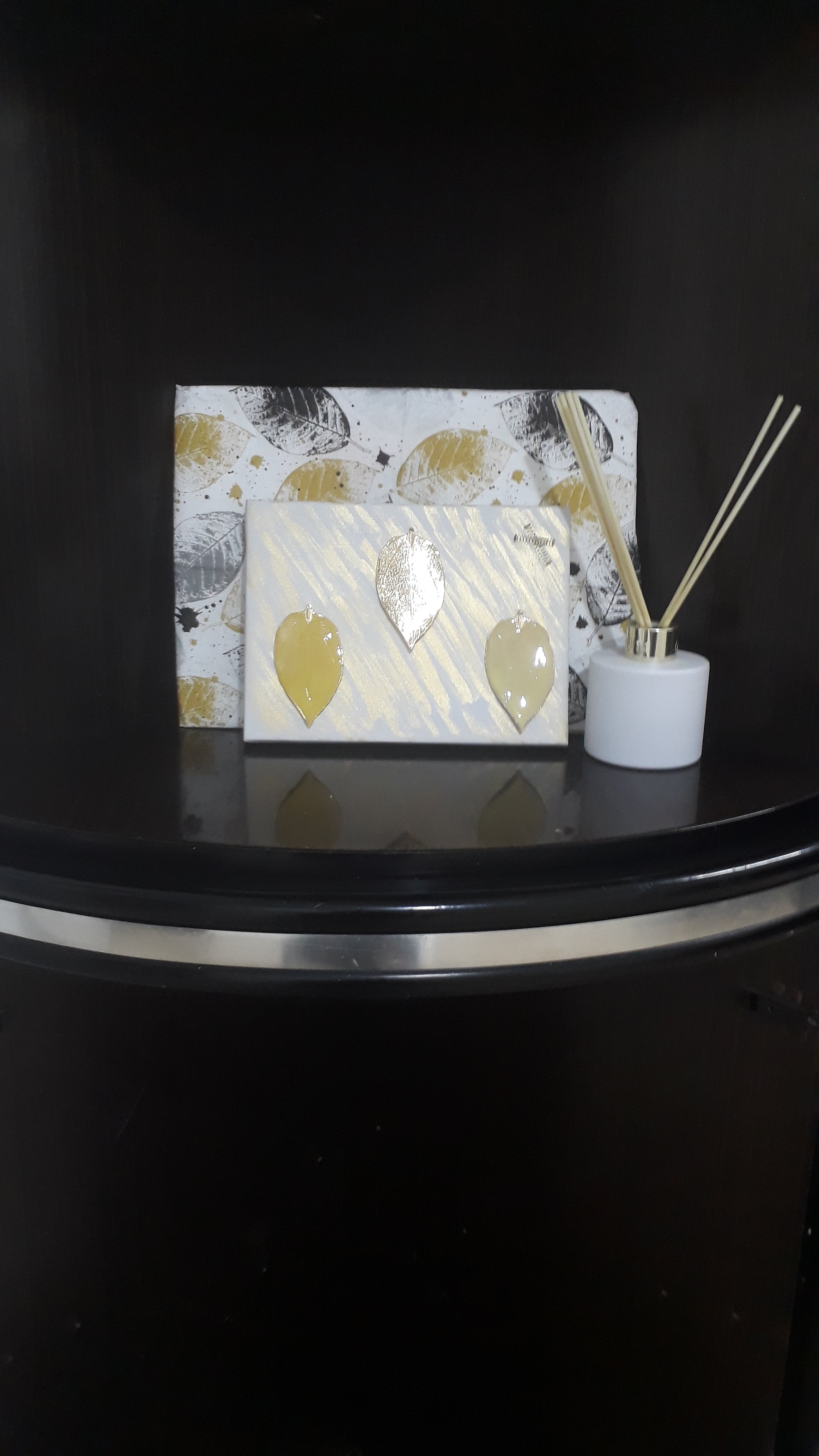 הלוחית מאחור מהכל בשקל, מצופה במפית שנשארה מאירוע חגיגי. מקדימה קנבס גם מהכל בשקל, נעוצים בה 3 עלים שפירקתי משרשרת פשוטה ואת הרקע צבעתי בצבע בד.