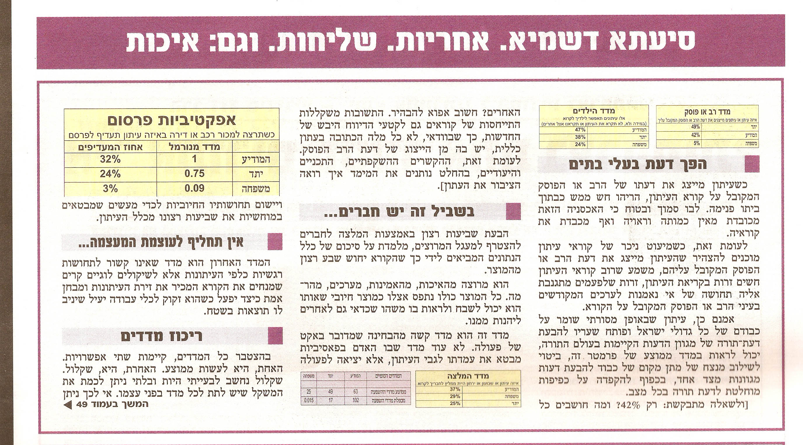 ומה שאמרת שם בענין החשיפה האיכותית, עם ההנחה שקורא מושפע יותר מעתון שהוא מזדהה עמו, זו הנחה פסיכולוגית שלא הוכחה כלל, וניתן בקלות לחלוק עליה או לקבלה.(הרי אינך מומחה בתחום הנפש.) שמעתי לא מעטים האומרים: ב'המודיע' אני מקבל איכות ורמה, תכנים לבית, אבל בעניני ריהוט לבית, למשל, שם מתאים לי 'משפחה!' בזה הם מבינים יותר! ב'המודיע' אקרא פרוש לתפילת הדרך ואת מקורה, אבל איזה רכב לקנות - את זה אלמד ב'משפחה'. זה התחום שלהם.