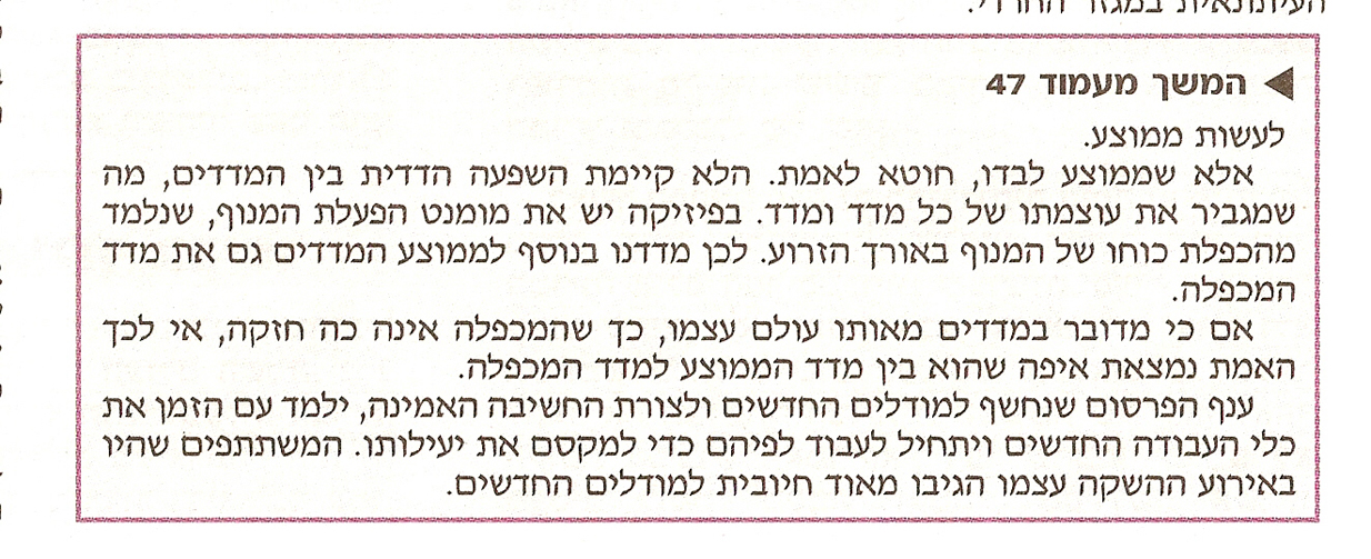 בשלב ראשון פניתי לד"ר יורם לבנון, ד"ר לבנון הינו מדען פיסיקאי (מכאן חוק המנוף במדד המכפלה :) ) ואיש אסרטגיה, סיפרתי לו על הפורום שלנו ובקשתי לשאול את שאלותי בתחום, אני חייבת לציין שהשיחה עם ד"ר לבנון היתה מחכימה, הרבה מעבר לסקר של המודיע