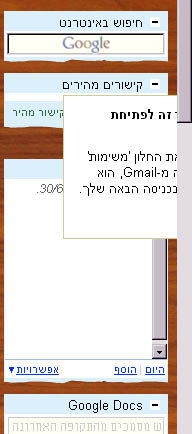 הפעלתי את כל האופציות בחלון הג'ימייל באנגלית, ואח"כ המרתי שפה חזרה לעברית. הופיע לי חלונית מעצבנת: (זו, הנמצאת בימין המסך, מוסתרת בחציה)