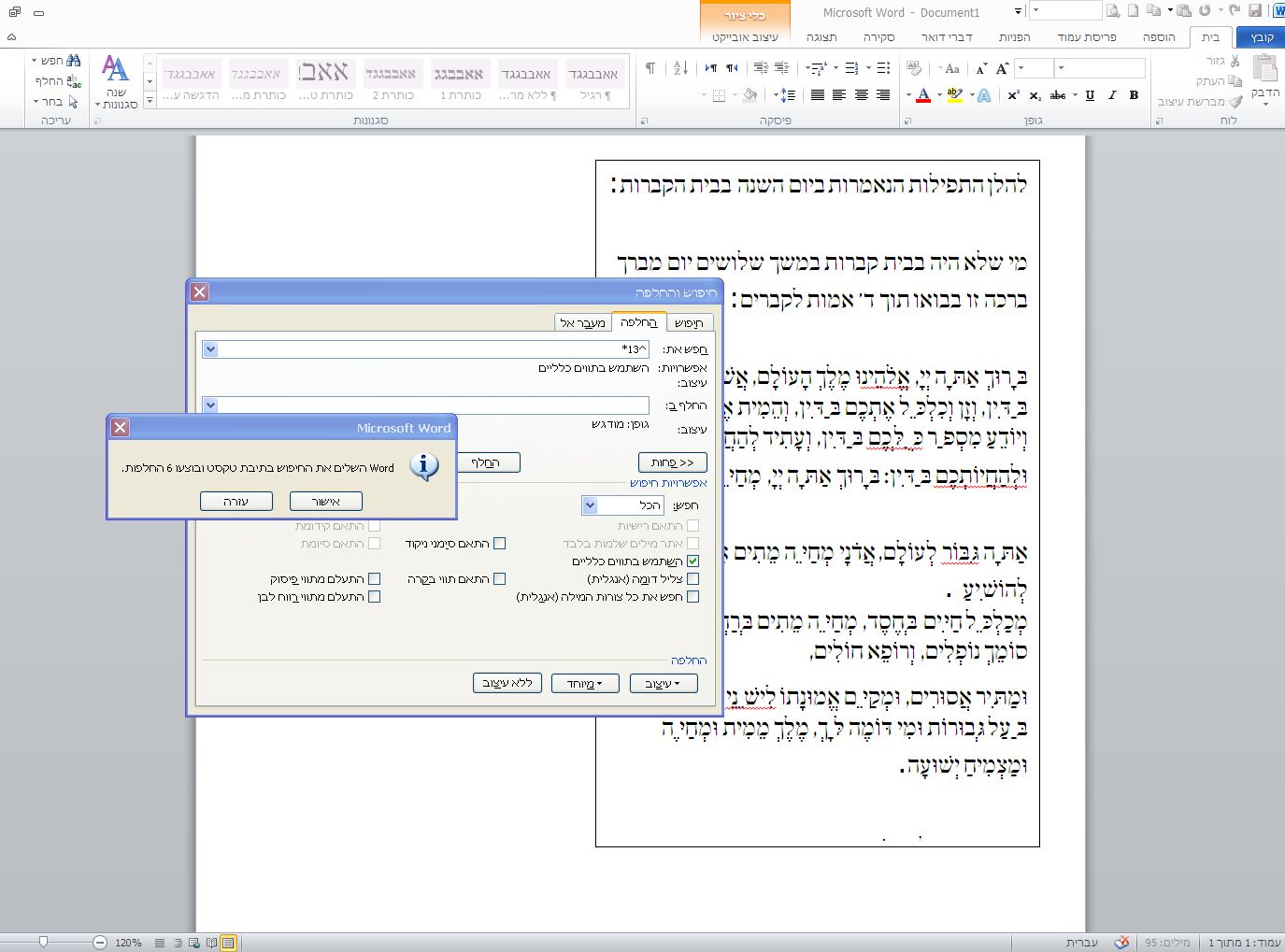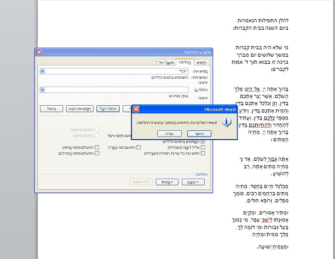 נ.ב.אני משתמש בוורד 2010 יוכל להיות שיש קשר?(לא כל כך נראה לי כי גם בפעם הקודמת טעיתי בקטע ששכתי ללחוץ על "החלף"לפני שקבעתי לו למה להחליף אז אני מתאר לעצמי שכנראה גם הפעם יש איזה בעיה מהסוג הזה)