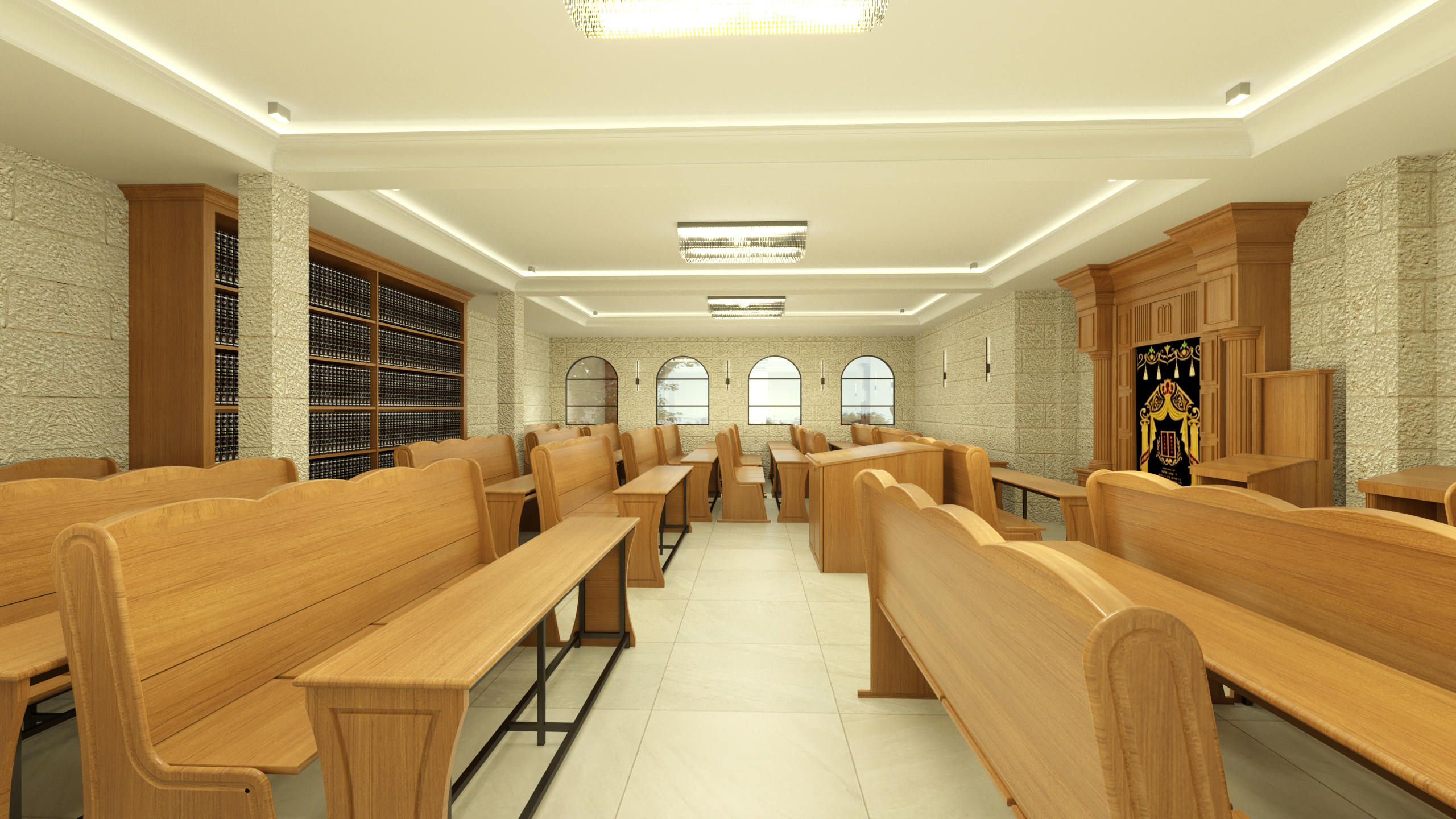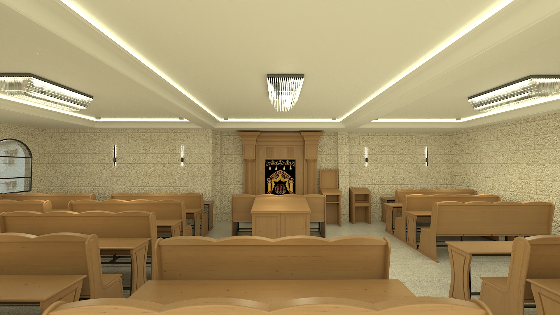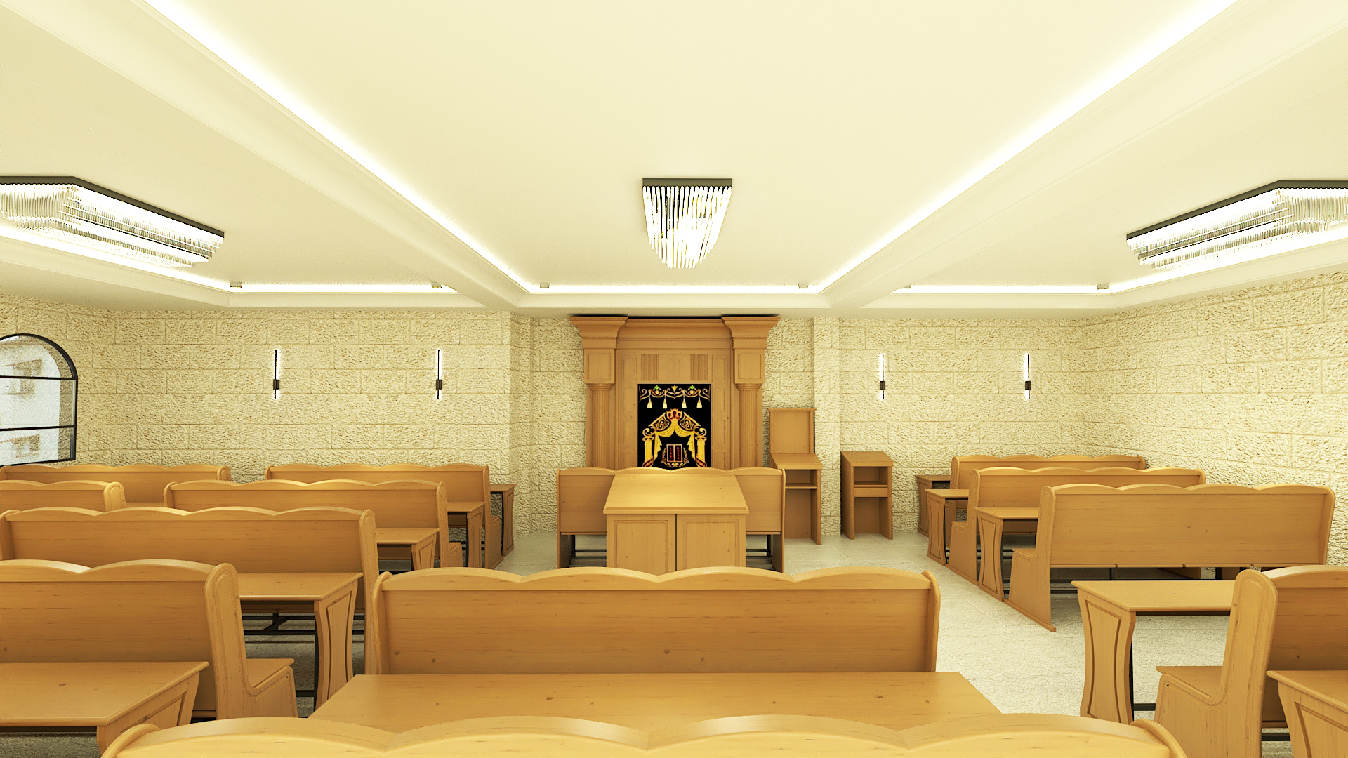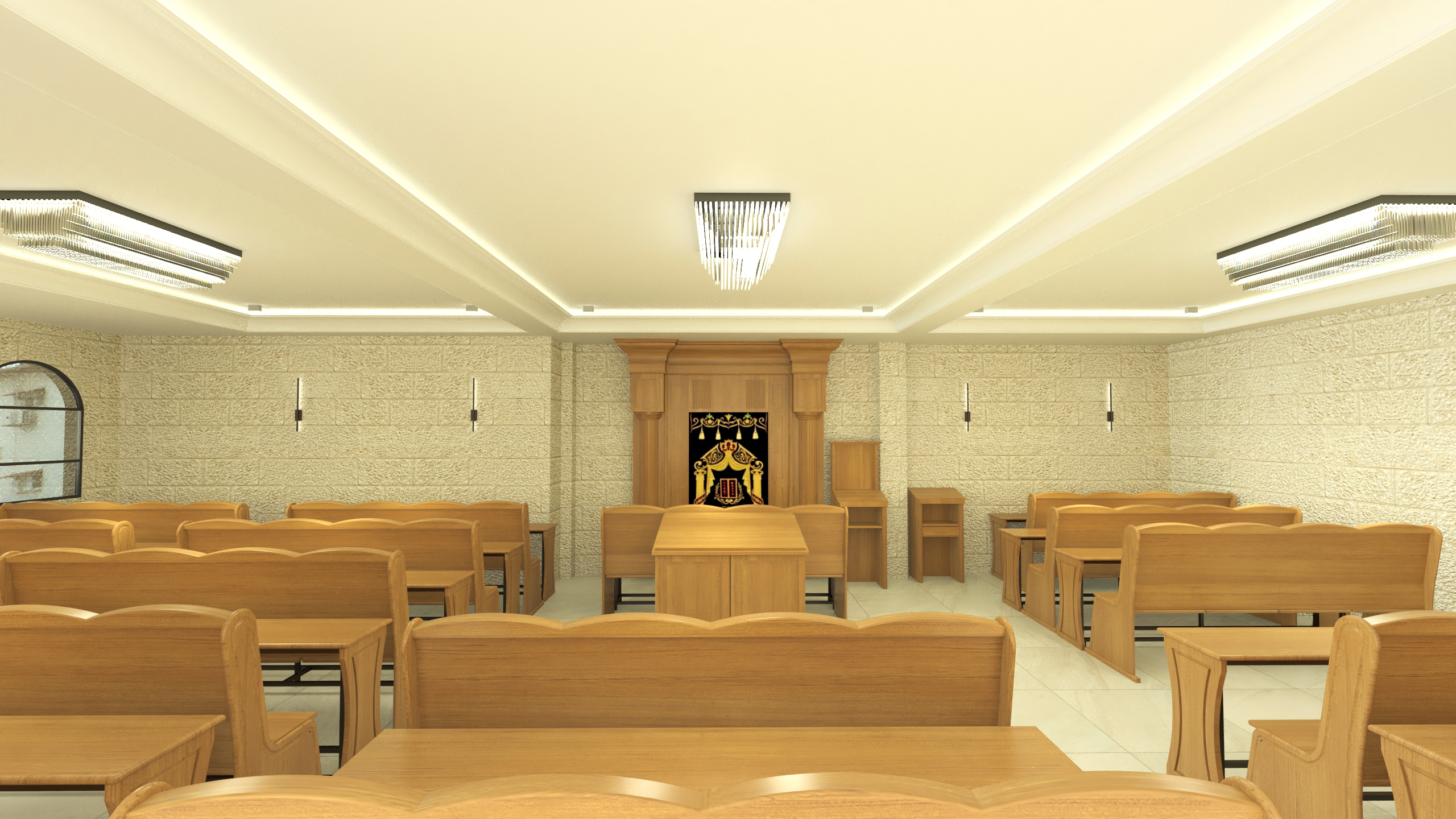 רואים מעט נגיעות של אור על משענות הספסלים והבימה, מה שבהחלט נותן חיים, צריך לזהות את זה בריצפה בקירות ובתקרה.