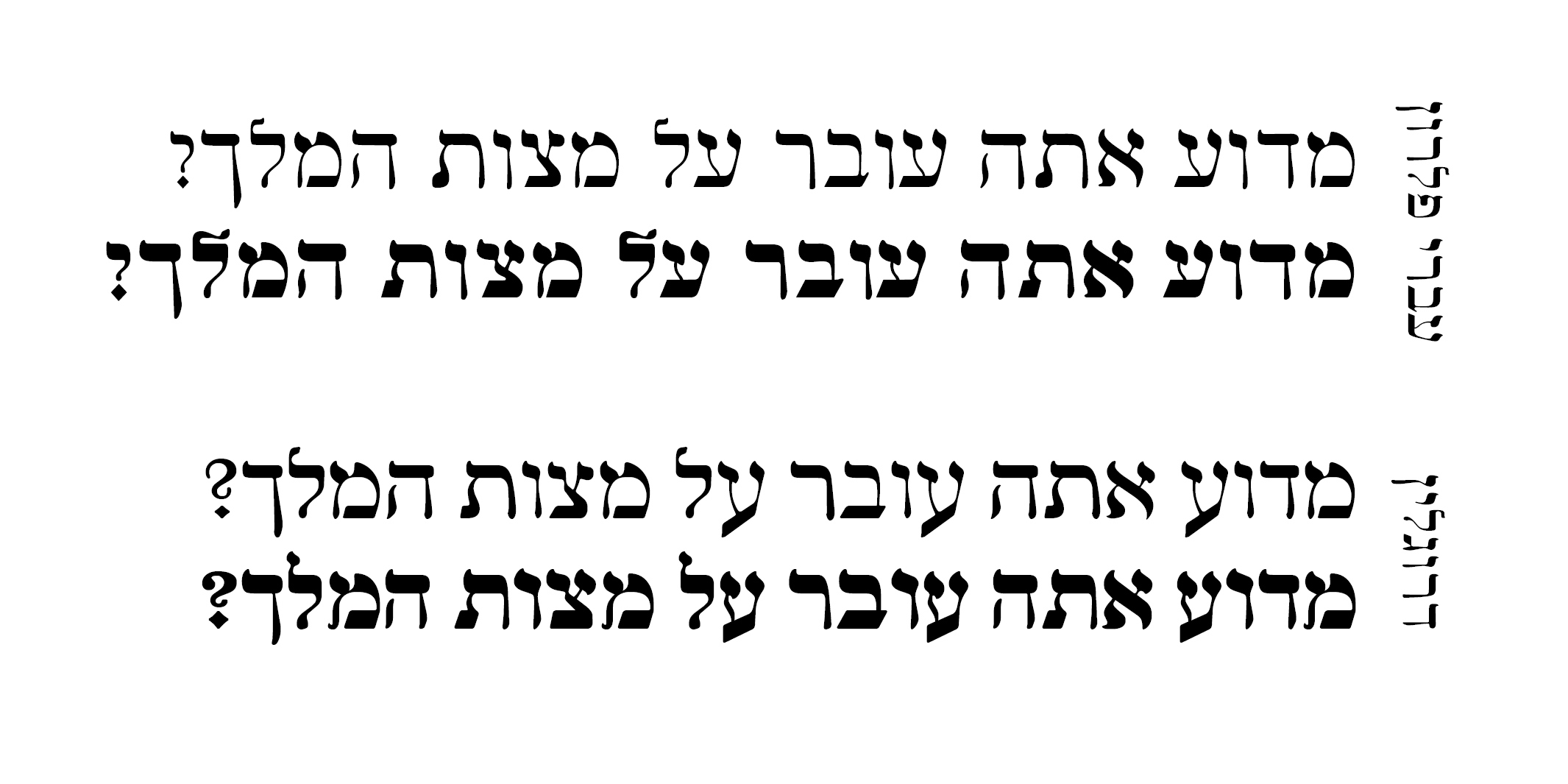 עברי הוא עיבוד של מרגליות, כלומר המשקל הרגיל, שעשו לו גם בולד שדומה לו בעיצוב.