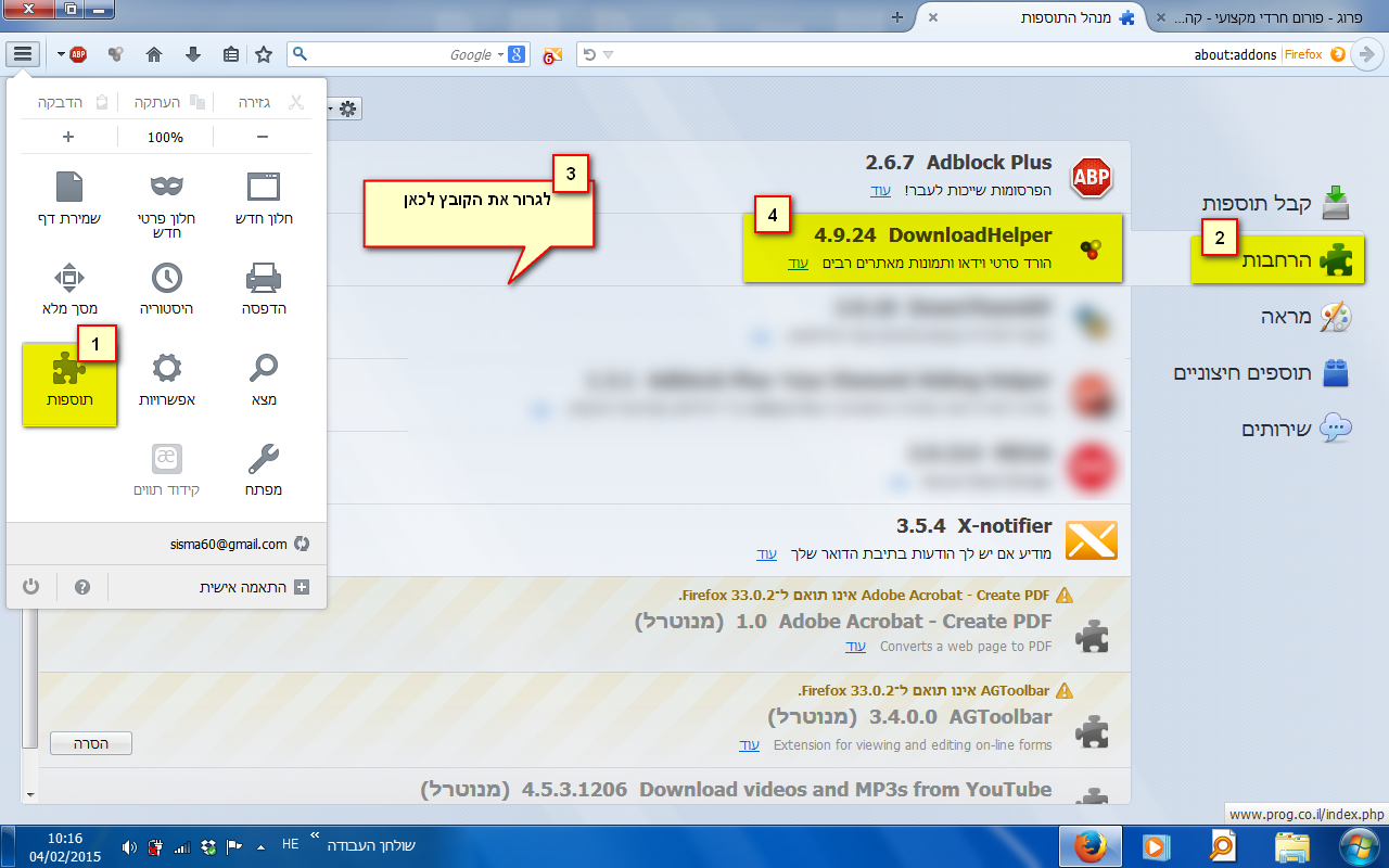 את הקובץ (אחרי החילוץ, הקובץ בסיומת xpi) יש לגרור לתוך חלון התוספים של הדפדפן. יש להיכנס ללחצן למעלה בצד שמאל (עם שלשה קווים לרוחב) ושם לבחור ב'תוספות' (סמל של פאזל), ובחלון שנפתח לגרור לתוכו את הקובץ הנ"ל.