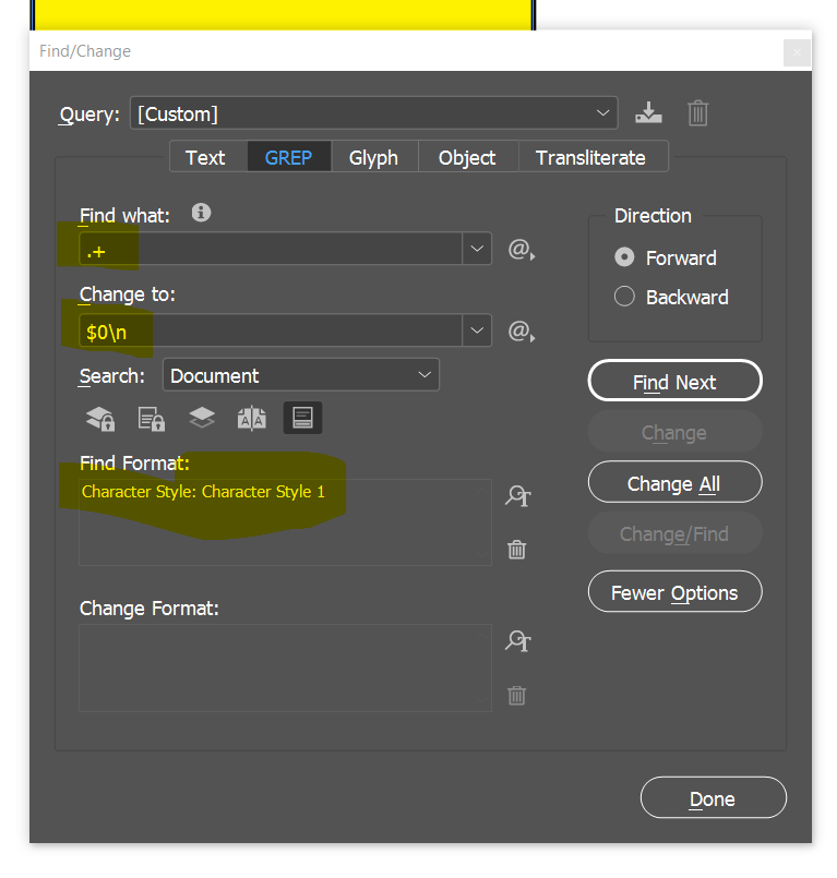 א. לא התכוונתיי שגרפ לא יכול להועיל. רק שאין סימן בגרפ לחפש סוף שורה. לא כמו שיש למשל סוף פסקה.האמת שהצלחתי בסוף - הגדרתי סגנון מקונן בסגנון פסקא (עם סגנון תו חדש שאין בו כלום), ואח"כ חיפשתי את סגנון התו הזה (לא הצלחתי בלי לחפש תוים עם סגנון התו הזה), והצלחתי להכניס אחריו לדוגמא - שבירת שורה (\n)