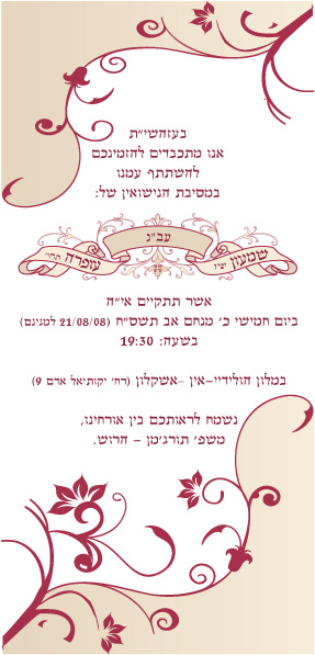 רק לא נראה לי שמתאים בכלל לכתוב את שם החתן והכלה בתוך העיטור הזה- זה מוריד מערכם - תעמידי אותם סתם כך יפה ומסודר בלי שום עיטור- וזה יראה הרבה יותר יפה