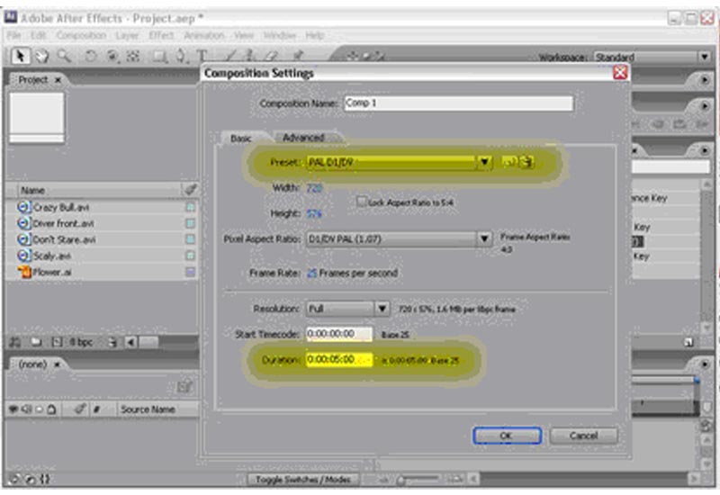 כעת ניצור קומפוזיציה במידות המתאימות לשיטת השידור בישראל, מומלץ לבחור בתבנית PAL D1/DV, יש לקבוע את האורך הרצוי, נקליד 0:00:05:00 בכדי לקבל 5 שניות ונאשר.<o></o>