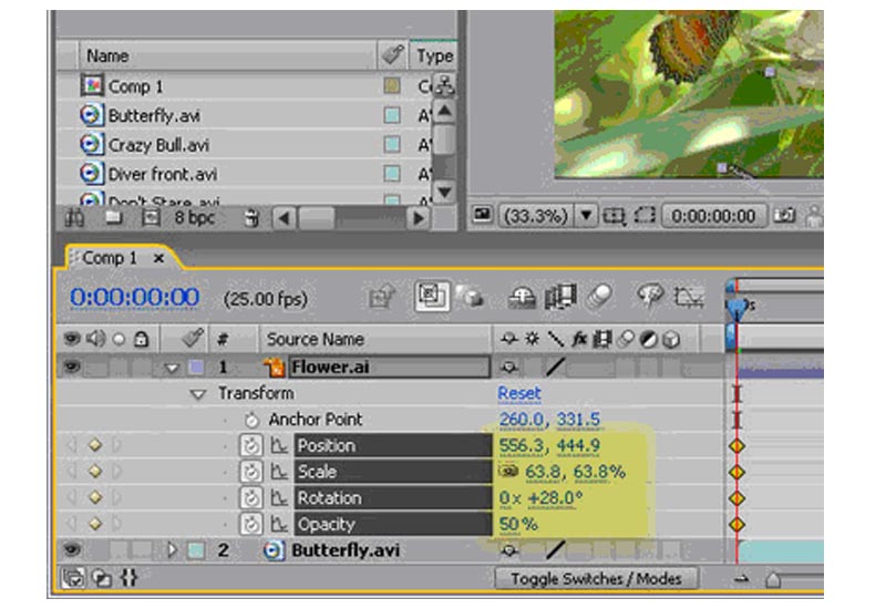 נגרור את הקבצים לחלון הTimeline, השכבות יופיעו אחת מעל השניה. נפתח את המשולש הקטן משמאל לשם השכבה ונשנה את המאפיינים. בכל מקום בו רואים צלמית של שעון עצר ניתן לייצר אנימציה על ידי שימוש בשיטת נקודות מפתח - Keyframe. בפריים הראשון נלחץ על השעון בכדי להוסיף נקודת מפתח במאפייני Scale, Position, Rotation ו-Opacity.<o></o>