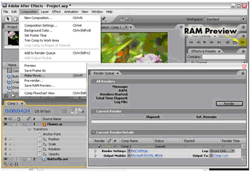 התוכנה תבצע חישוב לRAM ותציג את התוצאה בזמן אמת. אם אהבתם תוכלו לייצר סרטון סופי מהיצירה שלכם על ידי פקודת Make Movie בחלון Composition, מומלץ לבחור בתבנית Microsoft DV PAL 48 Khz וללחוץ על Render.