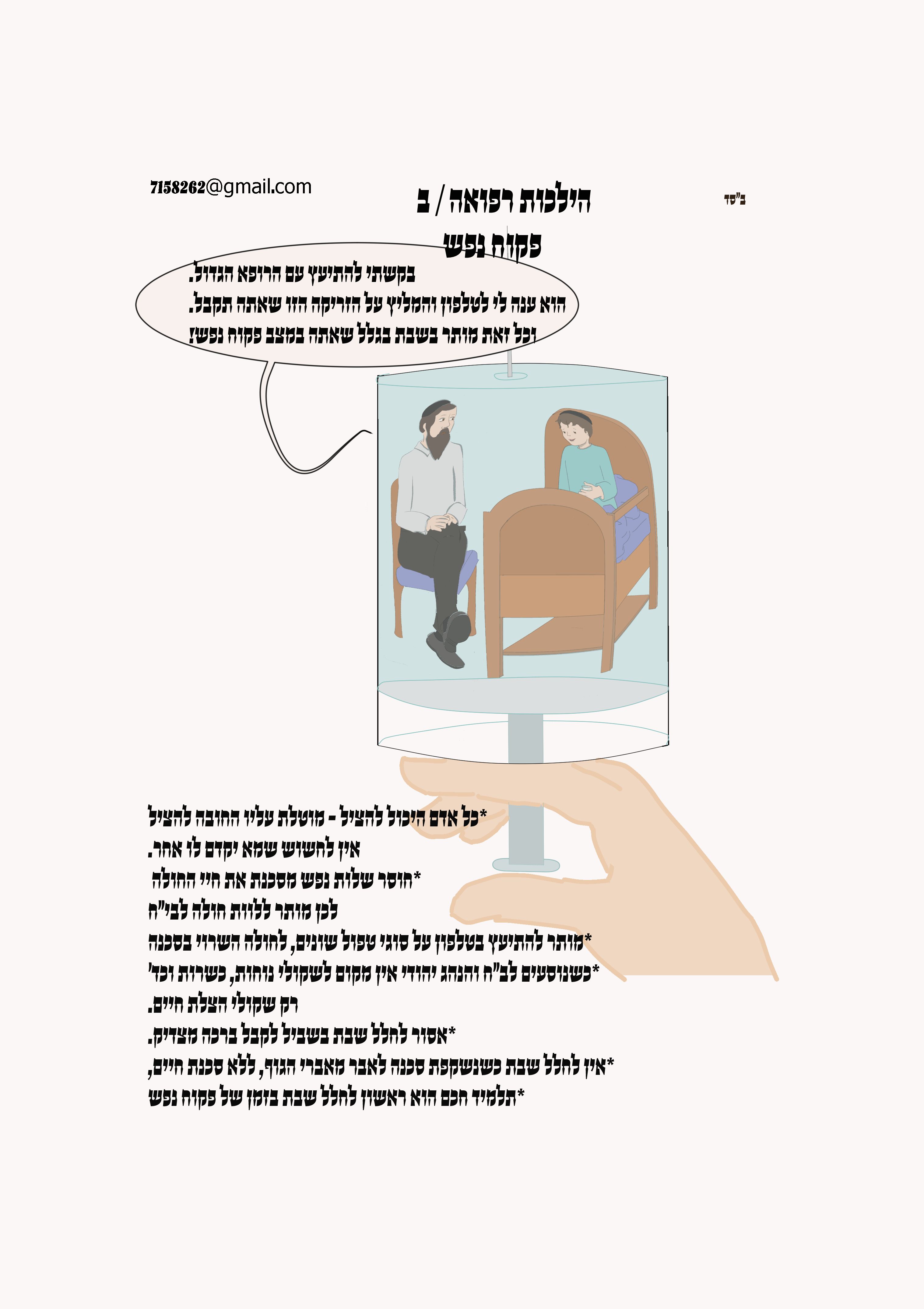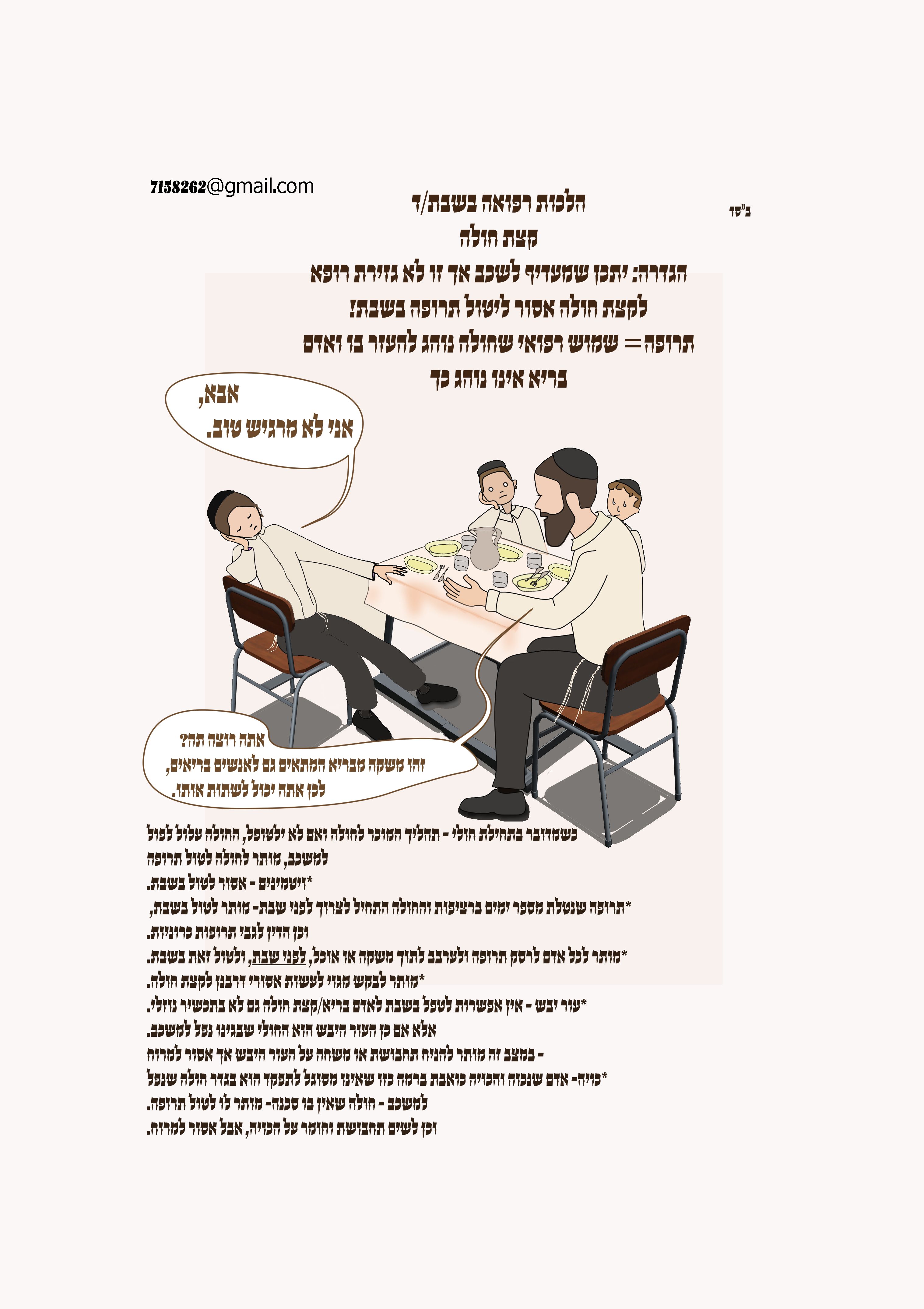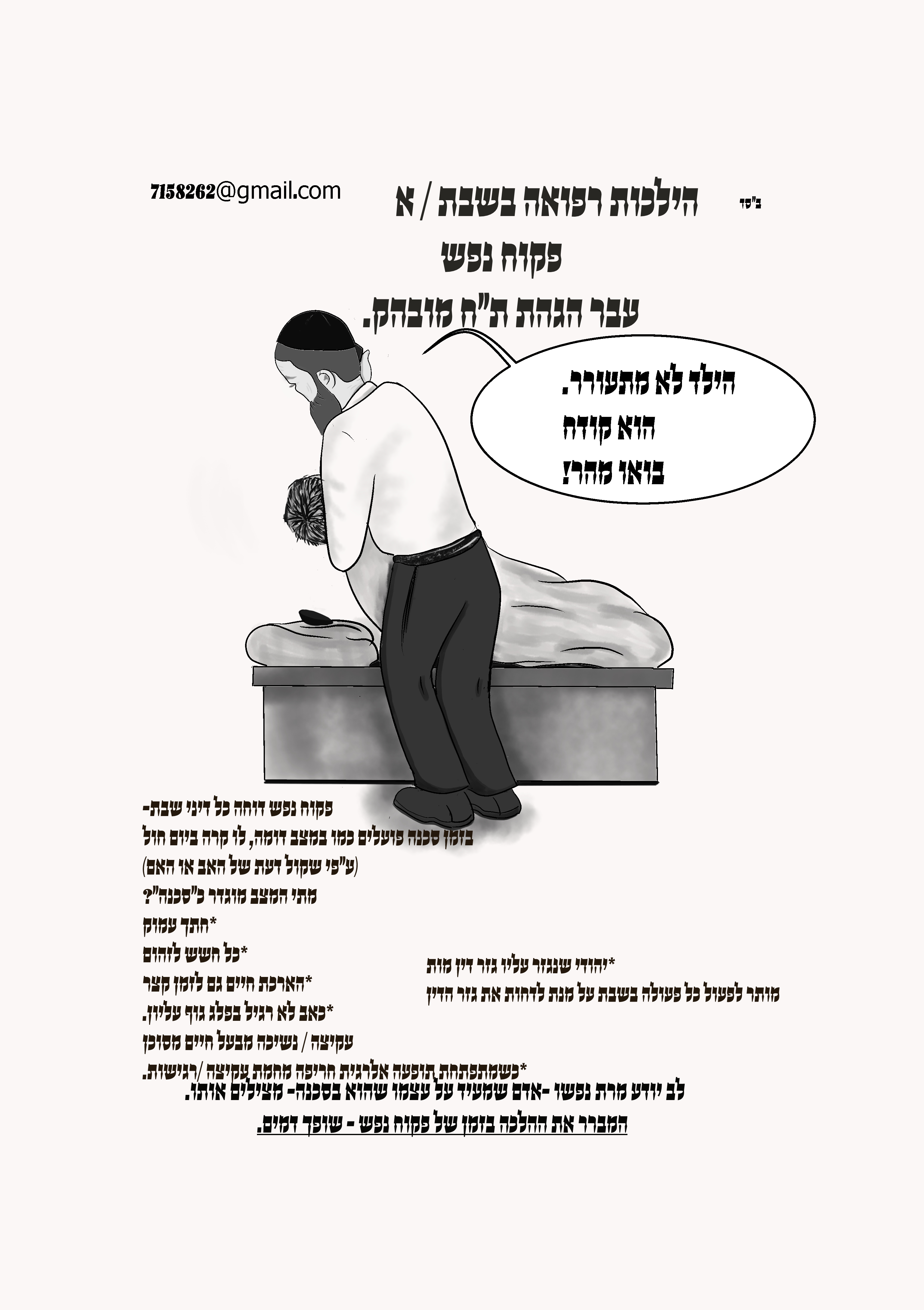 מצורפים 4 דפי הלכות בסיסיים, למקרי חרום ורפואה במהלך השבת. המתובלים באיורים קלילים.