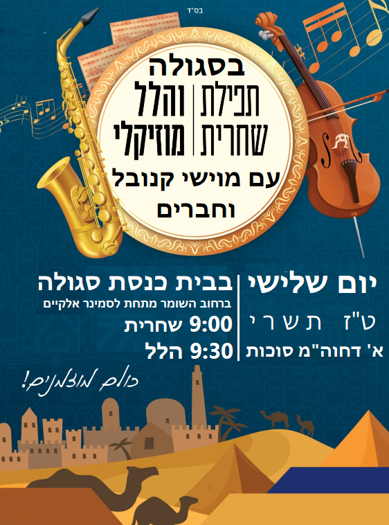 אנו שמחים להודיע על הלל מוזיקלי , בשירה ,ריקודים, ולווי כלי נגינה, שיתקיים מחר :