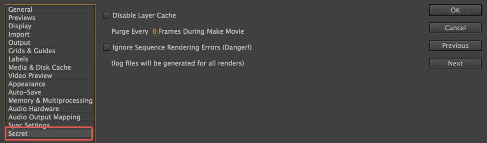 בשביל להגיע אליה פתחו את אפטר אפקט ולחצו על מקש Shift ובעוד שהמקש מוחזק נווטו אל Edit>Preference>General ושם למטה בצד שמאל תגלו לשונית בשם Secret (סודי)
