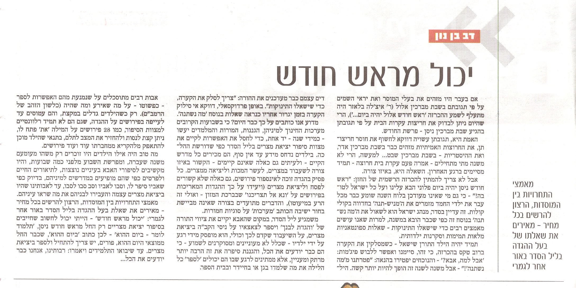 אשמח אם מישהו יעלה לכאן סריקה או יקליד.. אבל הוא ממש יורד על כך שהמחנכים והגננות היום מעמיסים חומר לפני פסח על הילדים, כאילו יש תחרות סמויה איזה חיידר יותר משקיע, או בוחנים את הגננת כמה הילדה יודעת יותר פירושים..