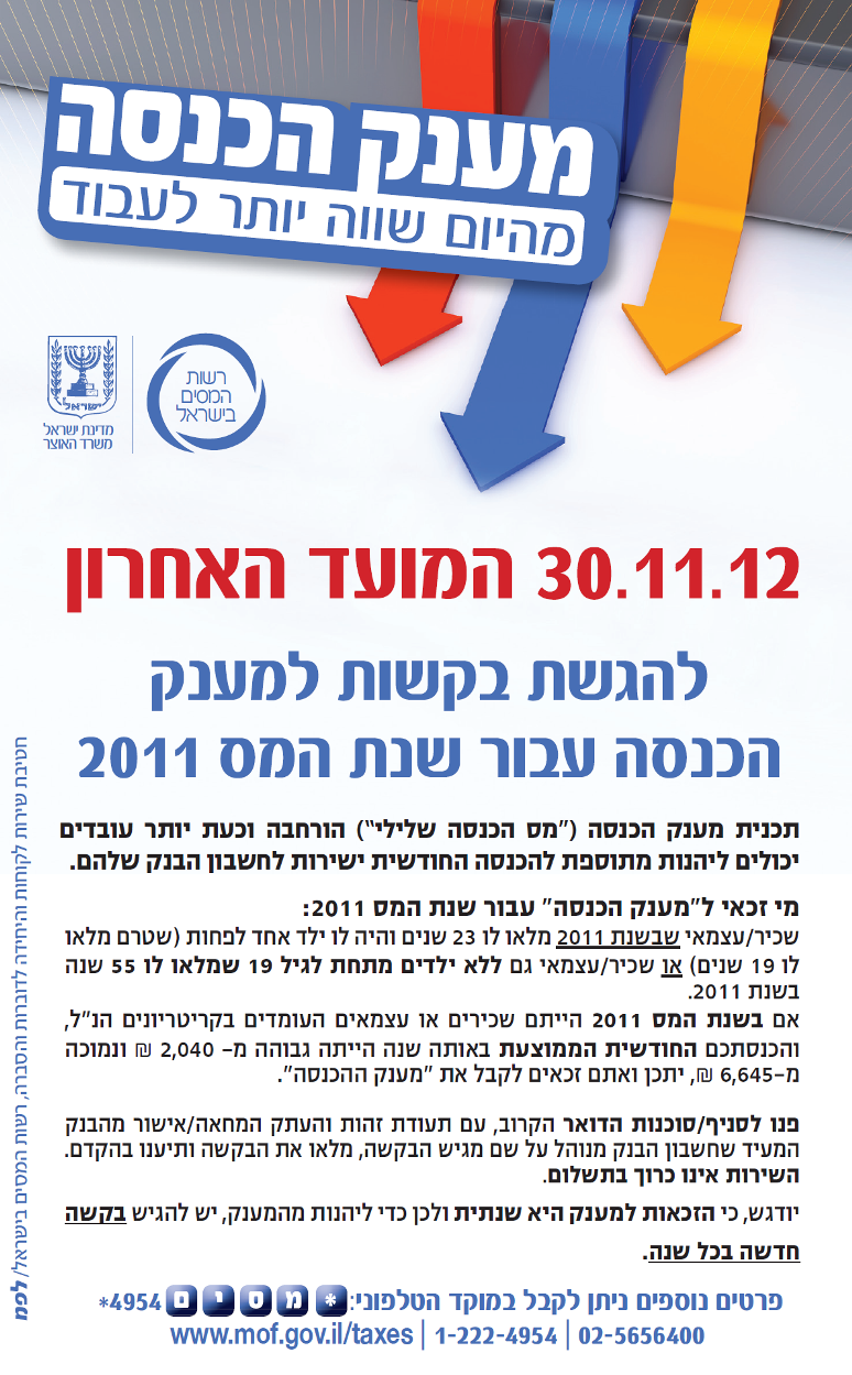 בנוסף, האריך מנהל רשות המסים את מועד הגשת הבקשות ל"מענק הכנסה" בשבועיים נוספים לכל תושבי הארץ עד ליום ה- 16.12.2012.