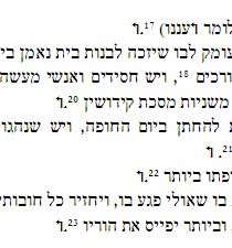אלְדָוִד אֵלֶיךָ יי נַפְשִׁי אֶשָּׂא:באֱלֹהַי בְּךָ בָטַחְתִּי אַל אֵבוֹשָׁה אַל יַעַלְצוּ אֹיְבַי לִי:גגַּם כָּל קוֶֹיךָ לֹא יֵבֹשׁוּ יֵבֹשׁוּ הַבּוֹגְדִים רֵיקָם:דדְּרָכֶיךָ יי הוֹדִיעֵנִי אֹרְחוֹתֶיךָ לַמְּדֵנִי:ההַדְרִיכֵנִי בַאֲמִתֶּךָ וְלַמְּדֵנִי כִּי אַתָּה אֱלֹהֵי יִשְׁעִי אוֹתְךָ קִוִּיתִי כָּל הַיּוֹם:וזְכֹר רַחֲמֶיךָ יי וַחֲסָדֶיךָ כִּי מֵעוֹלָם הֵמָּה:זחַטֹּאות נְעוּרַי וּפְשָׁעַי אַל תִּזְכֹּר כְּחַסְדְּךָ זְכָר לִי אַתָּה לְמַעַן טוּבְךָ יי:חטוֹב וְיָשָׁר יי עַל כֵּן יוֹרֶה חַטָּאִים בַּדָּרֶךְ:טיַדְרֵךְ עֲנָוִים בַּמִּשְׁפָּט וִילַמֵּד עֲנָוִים דַּרְכּוֹ:יכָּל אָרְחוֹת יי חֶסֶד וֶאֱמֶת לְנֹצְרֵי בְרִיתוֹ וְעֵדֹתָיו:יאלְמַעַן שִׁמְךָ יי וְסָלַחְתָּ לַעֲוֹנִי כִּי רַב הוּא:יבמִי זֶה הָאִישׁ יְרֵא יי יוֹרֶנּוּ בְּדֶרֶךְ יִבְחָר:יגנַפְשׁוֹ בְּטוֹב תָּלִין וְזַרְעוֹ יִירַשׁ אָרֶץ:ידסוֹד יי לִירֵאָיו וּבְרִיתוֹ לְהוֹדִיעָם:טועֵינַי תָּמִיד אֶל יי כִּי הוּא יוֹצִיא מֵרֶשֶׁת רַגְלָי:טזפְּנֵה אֵלַי וְחָנֵּנִי כִּי יָחִיד וְעָנִי אָנִי:יזצָרוֹת לְבָבִי הִרְחִיבוּ מִמְּצוּקוֹתַי הוֹצִיאֵנִי:יחרְאֵה עָנְיִי וַעֲמָלִי וְשָׂא לְכָל חַטֹּאותָי:יטרְאֵה אוֹיְבַי כִּי רָבּוּ וְשִׂנְאַת חָמָס שְׂנֵאוּנִי:כשָׁמְרָה נַפְשִׁי וְהַצִּילֵנִי אַל אֵבוֹשׁ כִּי חָסִיתִי בָךְ:כאתֹּם וָיֹשֶׁר יִצְּרוּנִי כִּי קִוִּיתִיךָ:כבפְּדֵה אֱלֹהִים אֶת יִשְׂרָאֵל מִכֹּל צָרוֹתָיו: