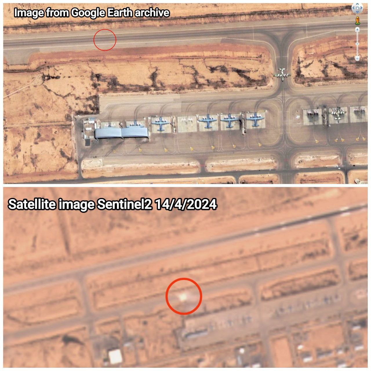 מקורות המזוהים עם הציר השיעי מנתחים תמונות לווין ומצביעים על הנזק שנגרם לטענתם למסלול ההמראה בבסיס נבטים, כתוצאה מהתקיפה האיראנית. אבו עלי