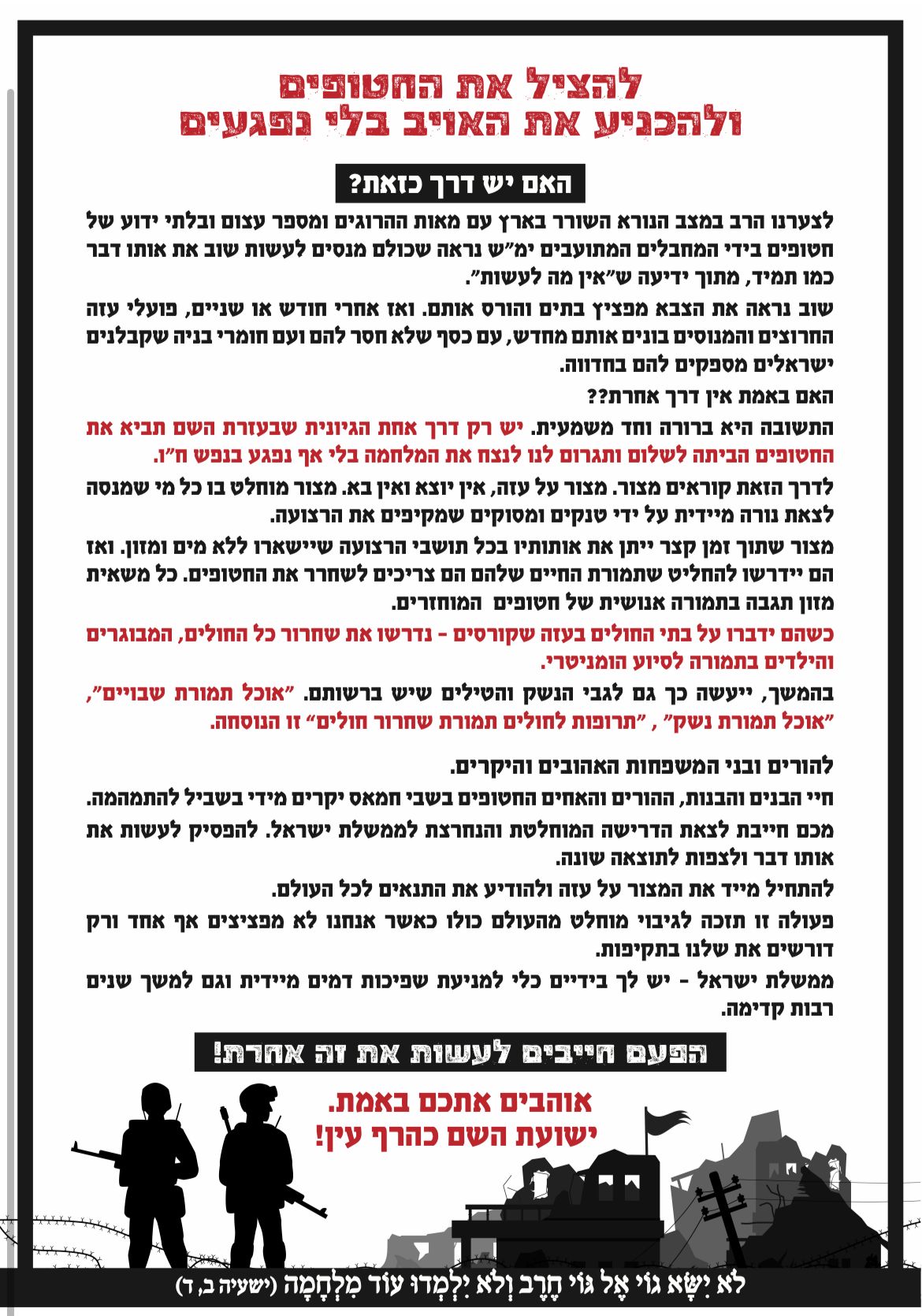 אתם לא תשחררו את השבויים והשבויות, אתם תהרגו לחינם מאות חיילים נוספים ובסוף הרי תלכו לעסקת שבויים מפוארת ומדינת ישראל תצא מזה נמוך עוד יותר משנכנסה.