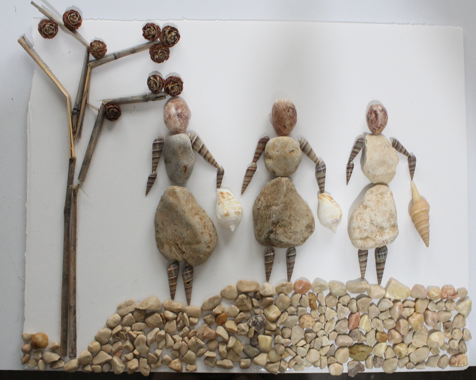 כל היצירה באבנים ענפים וצדפים חומים