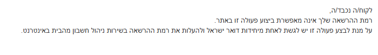 מישהוא כבר הצליח לעשות העברה בנקאית דרך האתר של בנק הדואר (למי שיש חשבון שם), הם אומרים שאין לי הרשאה לזה ועלי לגשת לסניף לקבל הרשאה, זה מה שעשיתי, ועדיין זה לא עובד וכמצורף בתמונה.