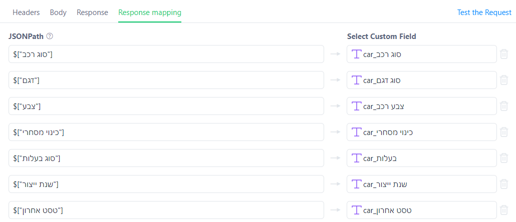 צריך להחזיר רספונס במייק וב-body מכניסים json עם הנתונים שרוצים להחזיר, אחרי זה במייק מכיניסים בResponse mapping את הנתונים שמתקבלים בjson לתוך custom field's, בצד של JSONPath מכניסים את המיפוי של הjson (אפשר באמצעות האתר הזה) ובצד השני בוחרים את קאסטם פילד שלתוכו יוכנסו הנתונים