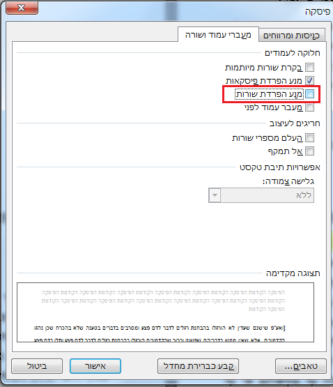 נקה את תיבת הסימון מנע הפרדת שורות.