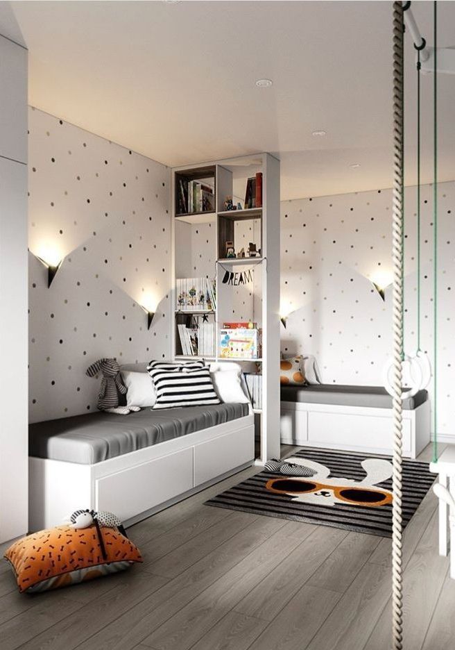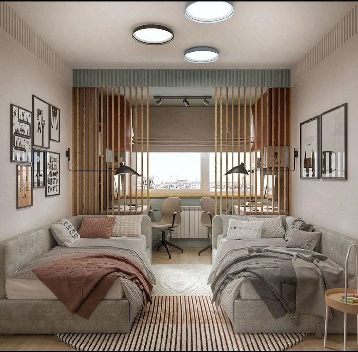 אפשר לעשות מחיצות בקטנה בתוך החדר עם תכנון נכון של הריהוט או ריהוט בהתאמה אישית, לא הייתי עושה מיטה ליד מיטה. הייתי מפצלת את המיטות. ונותנת לכל מיטה איזה שידה קטנה או שולחן.
