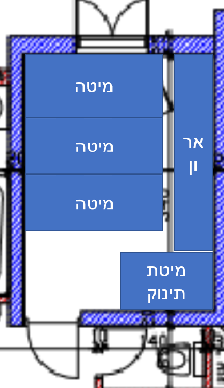 העמדה של @byy טובה אבל הייתי הופכת את המיקום המיטה מול הדלת והמיטת תינוק בפנים ככה נשאר חלל יותר מרווח בחדר שהמיטות סגורות