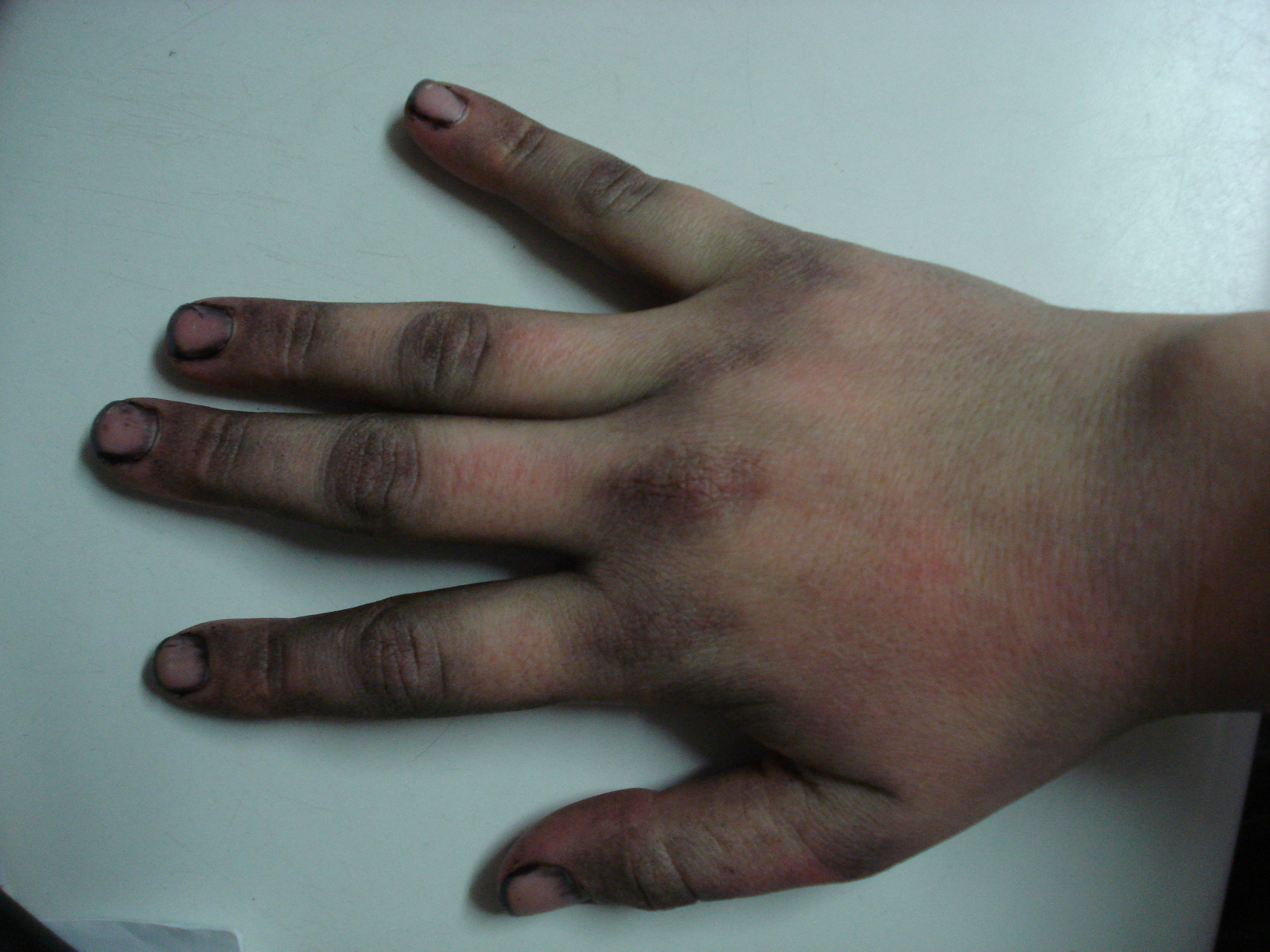 ירד הרוב. היד נשארה אפרורית עם כתמים וכוויות..