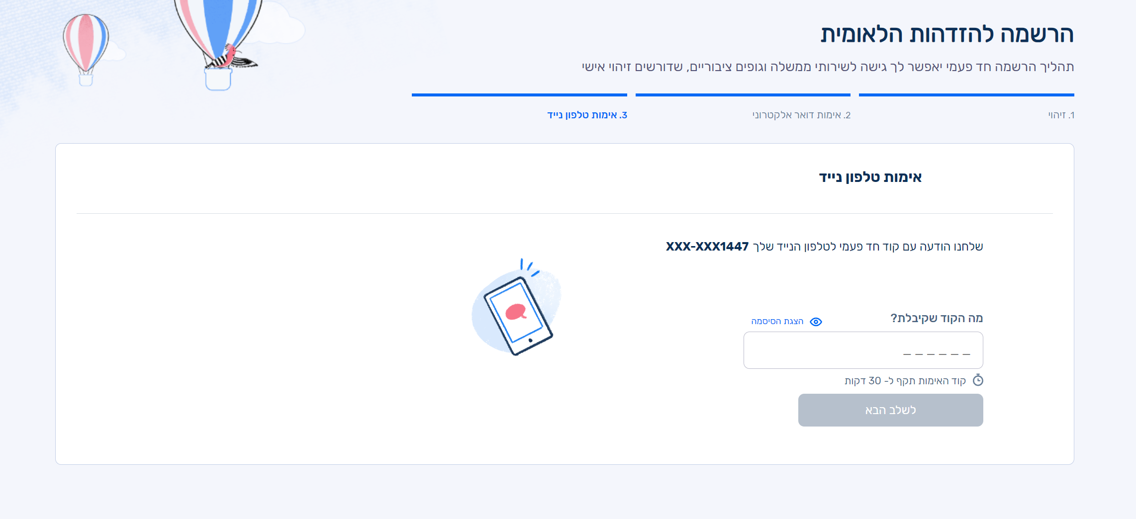 בשלב הראשון של ההרשמה ("זיהוי") המערכת נותנת לך אפשרות בחירה איך לקבל הודעות בטלפון, בברירת המחדל הוא מעודכן על sms וצריך לשנות את זה להודעה קולית. אם עדיין לא סיימת את ההרשמה אפשר לחזור אחורה ולהירשם מחדש.