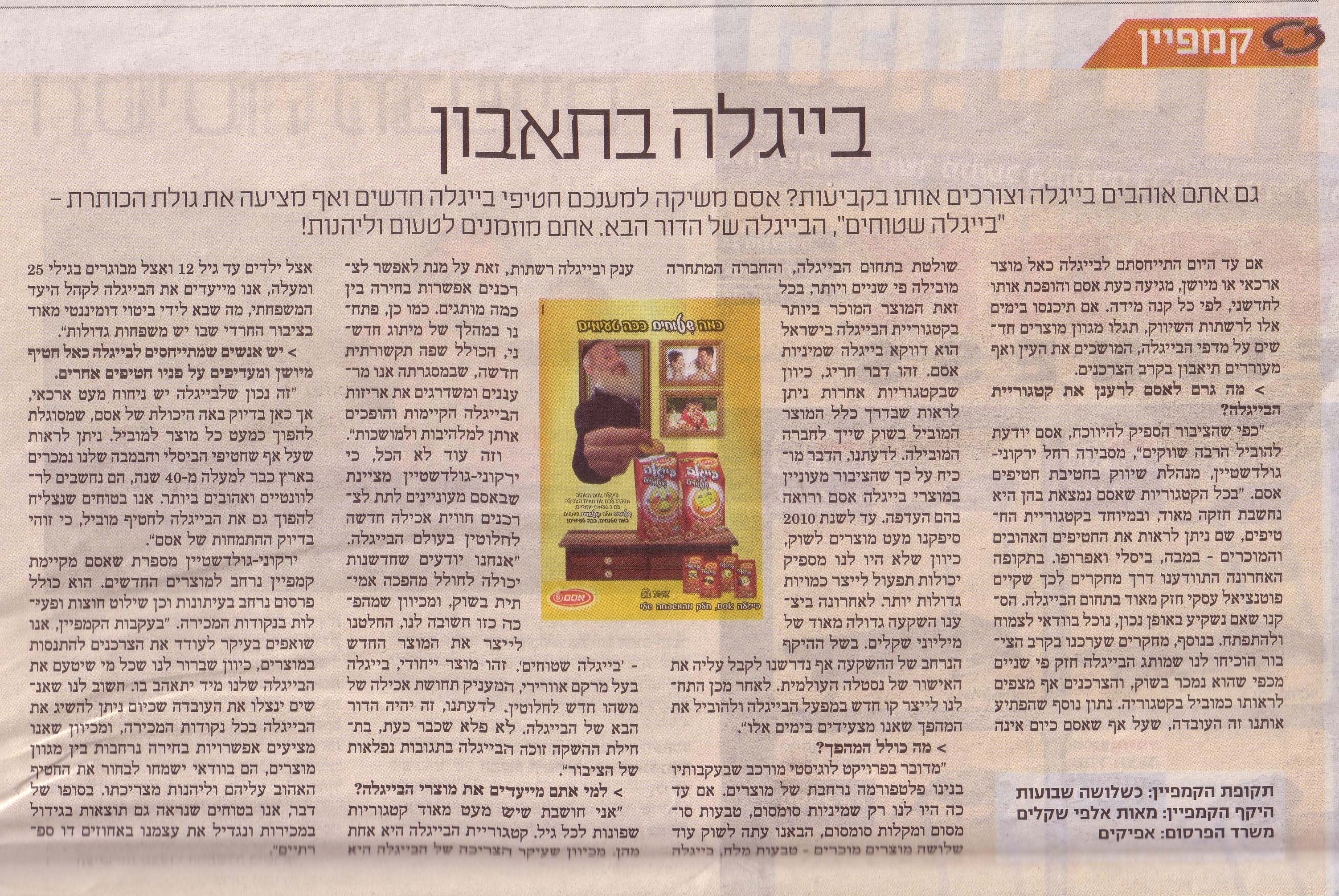 "תרגיל מבריק ביחסי ציבור או מחסור אמיתי בחטיף? אסם העלתה אריזה של בייגלה "שטוחים" למכירה פומבית באתר eBay, לאחר שאזל מהמדפים. מחיר הבייגלה עומד עתה על 56 דולר לאריזת 350 גרם, לעומת 12 שקל במחיר רגיל. נכון לאתמול אחר הצהריים היו למוצר 18 הצעות, אשר סביר להניח כי לא כולן אמיתיות. מאסם נמסר כי ההכנסות מהמכירה יועברו לתרומה.