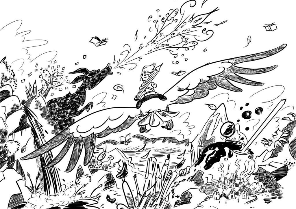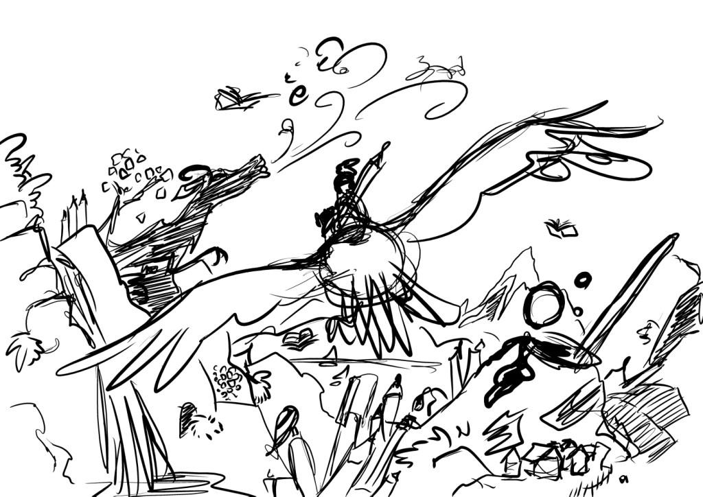 הדמויות לא ברורות וחדות כתער, תדגיש במלוא התמונה את הכוחות החזקים, הדרגון ורכב האביר, ותוריד מעומס האובייקטים, תוריד לגמרי את הקווים, ותעבור לצבע מלא,