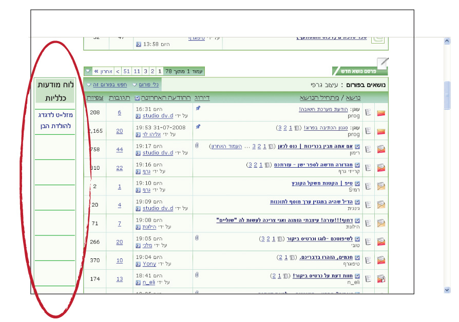 אולי- אם אפשר בתוך הפורום של "עיצוב גרפי" לשים "לוח מודעות"- מין פס מוארך כזה מתחילת העמוד למעלה ועד סופו, לצד ההודעות, שבו חברי הפורום פשוט יוכלו "לתלות" מודעה קטנה כמו "מזל טוב ל-- על הולדת הבן", וכאשר אתה לוחץ על הכותרת, זה מוביל אותך לאותו אשכול.