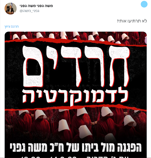 מארגני המחאות על המחאה מחר בבני ברק: זו הפעם הראשונה בה נקיים הפגנה מחוץ לבית של חבר כנסת מהמפלגות החרדיות. תחת הכותרת 'חרדים לדמוקרטיה', זו יריית פתיחה למהלך רחב היקף נגד מעורבותם של חברי הכנסת החרדים בקידום חוקי ההפיכה המשטרית, ובראשם גפני, המארגנים מצפים ממשטרת ישראל להיערך בהתאם