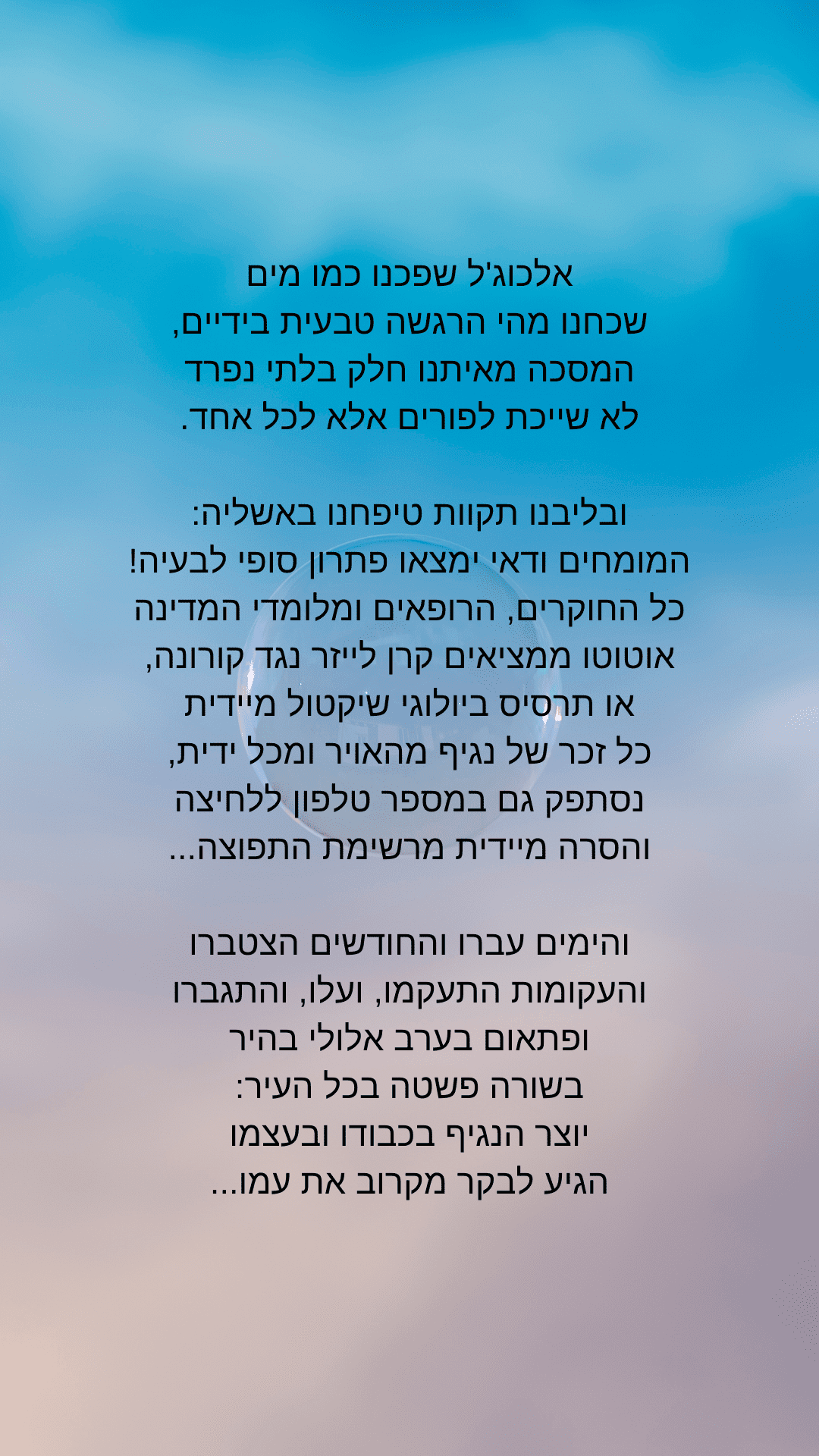 בתחילה חשבתי שהשורה האחרונה (האותיות הקטנות) מיותרת, כי זה לא הסגנון של השיר וגם כי המסר כל כך חזק שכבר לא צריך להוסיף את זה.